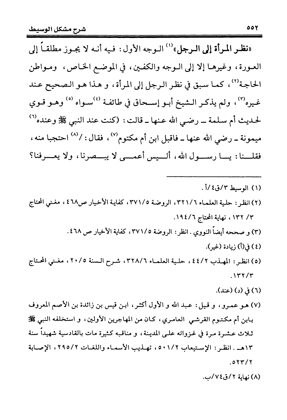 "نظر المرأة إلى الرجل" (¬1) الوجه الأول: فيه أنه لا يجوز مطلقاً إلى العورة، وغيرها إلا إلى الوجه والكفين، في الموضع الخاص، ومواطن الحاجة (¬2)، كما سبق في نظر الرجل إلى المرأة، وهذا هو الصحيح عند غيره (¬3)، ولم يذكر الشيخ أبو إسحاق في طائفة (¬4) سواه (¬5) وهو قوي لحديث أم سلمة - رضي الله عنها - قالت: (كنت عند النبي - صلى الله عليه وسلم - وعنده (¬6) ميمونة - رضي الله عنها - فاقبل ابن أم مكتوم (¬7)، فقال: (¬8) احتجبا منه، فقلنا: يا رسول الله، أليس أعمى لا يبصرنا, ولا يعرفنا؟