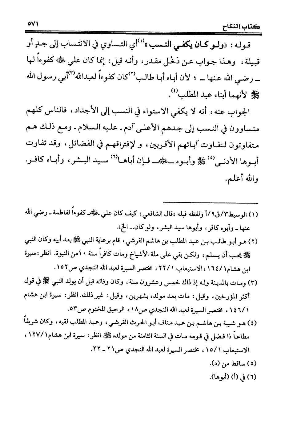 (¬1) الوسيط 3/ ق 9/ أولفظه قبله "قال الشافعي: كيف كان علي - رضي الله عنه - كفوءاً لفاطمة - رضي الله عنها - وأبوه كافر، وأبوها سيد البشر، ولو كانت ... إلخ".