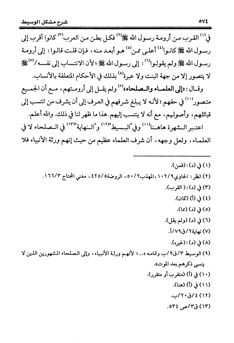 وقال: "إلى العلماء والصلحاء" (¬9) ولم يقل إلى أرومتهم، مع أن الجميع متصور (¬10) في حقهم؛ لأنه لا يبلغ شرفهم في العرف إلى أن يشرف من انتسب إلى قبائلهم، وأصولهم، مع أنه لا ينتسب إليهم. هذا ما ظهر لنا في ذلك. والله أعلم.