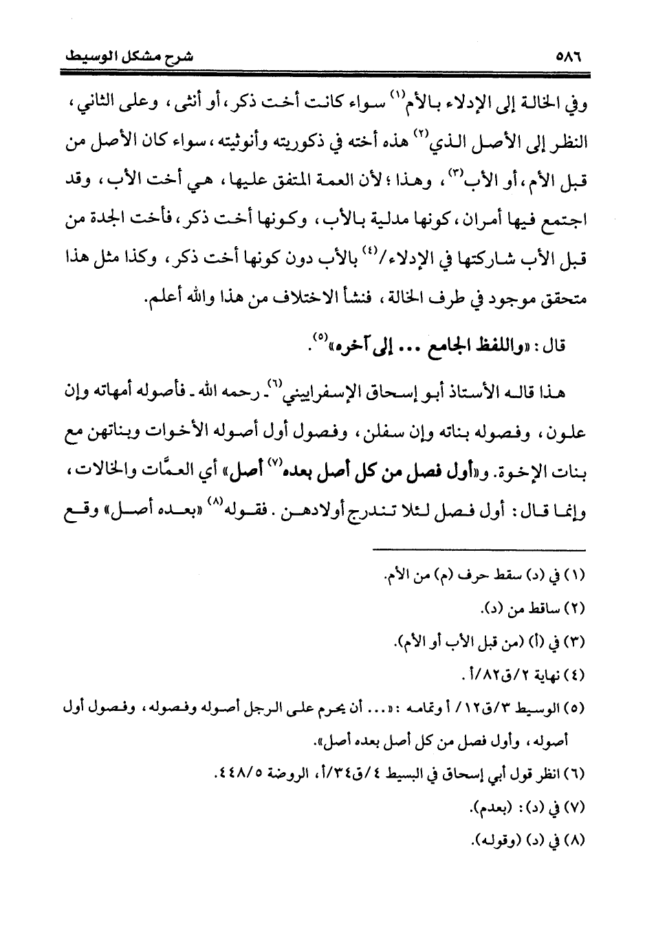 (¬5) الوسيط 3/ ق 12/ أوتمامه: " ... أن يحرم على الرجل أصوله وفصوله، وفصول أول أصوله، وأول فصل من كل أصل بعده أصل".