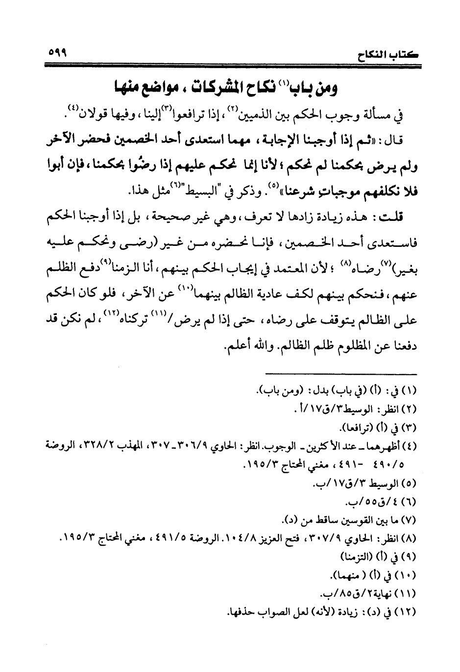 قلت: هذه زيادة زادها لا تعرف، وهي غير صحيحة، بل إذا أوجبنا الحكم فاستعدى أحد الخصمين، فإنا نحضره من غير (رضى ونحكم عليه بغير) (¬7) رضاه (¬8)؛ لأن المعتمد في إيجاب الحكم بينهم، أنا الزمنا (¬9) دفع الظلم عنهم، فنحكم بينهم لكف عادية الظالم بينهما (¬10) عن الآخر، فلو كان الحكم على الظالم يتوقف على رضاه، حتى إذا لم يرض (¬11) تركناه (¬12)، لم نكن قد دفعنا عن المظلوم ظلم الظالم. والله أعلم.