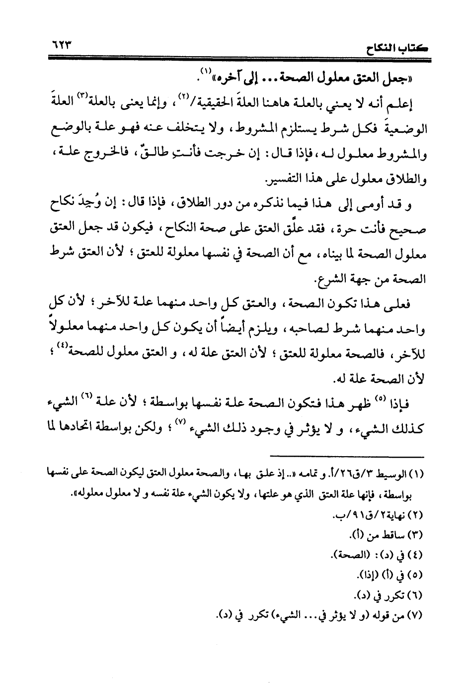 (¬1) الوسيط 3/ ق 26/ أ. وتمامه " ... إذ علق بها، والصحة معلول العتق ليكون الصحة على نفسها بواسطة، فإنها علة العتق الذي هو علتها, ولا يكون الشيء علة نفسه ولا معلول معلوله".