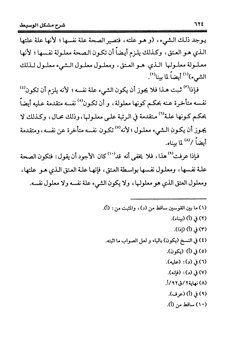 فإذا عرفت (¬9) هذا، فلا يخفى أنه قد (¬10) كان الأجود أن يقول: فتكون الصحة علة نفسها، ومعلول نفسها بواسطة العتق، فإنها علة العتق الذي هو علتها، ومعلول العتق الذي هو معلولها, ولا يكون الشيء علة نفسه ولا معلول نفسه.