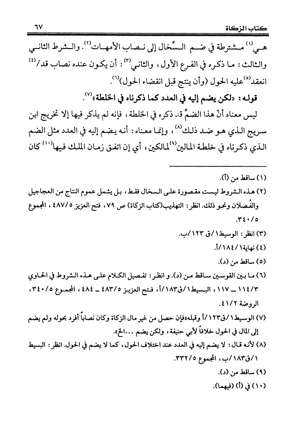 (¬2) هذه الشروط ليست مقصورة على السخال فقط، بل يشمل عموم النتاج من العجاجيل والفُصلان ونحو ذلك. انظر: التهذيب (كتاب الزكاة) ص 79، فتح العزيز 5/ 487، المجموع 5/ 340.