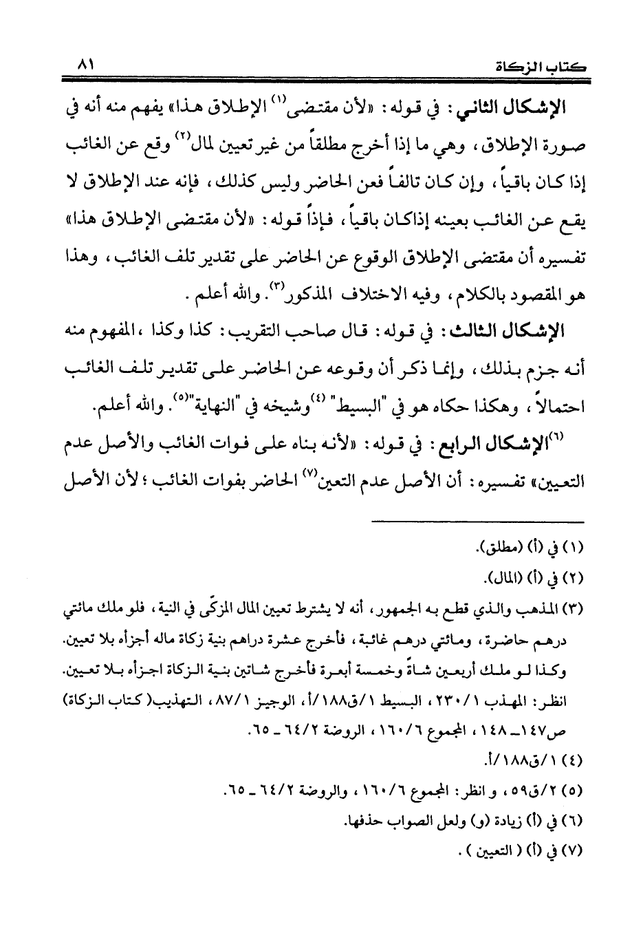 الإشكال الثاني: في قوله: "لأن مقتضى (¬1) الإطلاق هذا" يفهم منه أنه في صورة الإطلاق، وهي ما إذا أخرج مطلقاً من غير تعيين لمال (¬2) وقع عن الغائب إذا كان باقياً، وإن كان تالفاً فعن الحاضر وليس كذلك، فإنه عند الإطلاق لا يقع عن الغائب بعينه إذا كان باقياً، فإذاً قوله: "لأن مقتضى الإطلاق هذا" تفسيره أن مقتضى الإطلاق الوقوع عن الحاضر على تقدير تلف الغائب، وهذا هو المقصود بالكلام، وفيه الاختلاف المذكور (¬3). والله أعلم.
