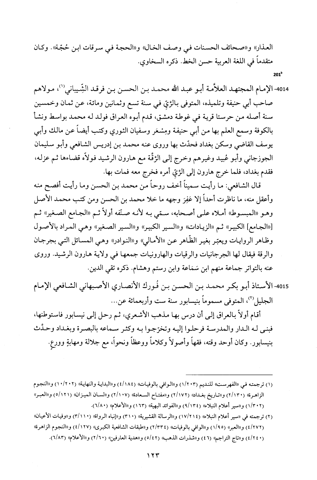 4014 - الإمام المجتهد العلاَّمة أبو عبد الله محمد بن الحسن بن فرقد الشِّيباني (¬1)، مولاهم صاحب أبي حنيفة وتلميذه، المتوفى بالرَّيِّ في سنة تسع وثمانين ومائة، عن ثمان وخمسين سنة أصله من حرستا قرية في غوطة دمشق، قدم أبوه العراق فولد له محمد بواسط ونشأ بالكوفة وسمع العلم بها من أبي حنيفة ومِسْعَر وسفيان الثوري وكتب أيضاً عن مالك وأبي يوسف القاضي وسكن بغداد فحدّث بها وروى عنه محمد بن إدريس الشافعي وأبو سليمان الجوزجاني وأبو عُبيد وغيرهم وخرج إلى الرَّقَّة مع هارون الرشيد فولاّه قضاءها ثم عزله، فقدم بغداد، فلما خرج هارون إلى الرَّيِّ أمره فخرج معه فمات بها.