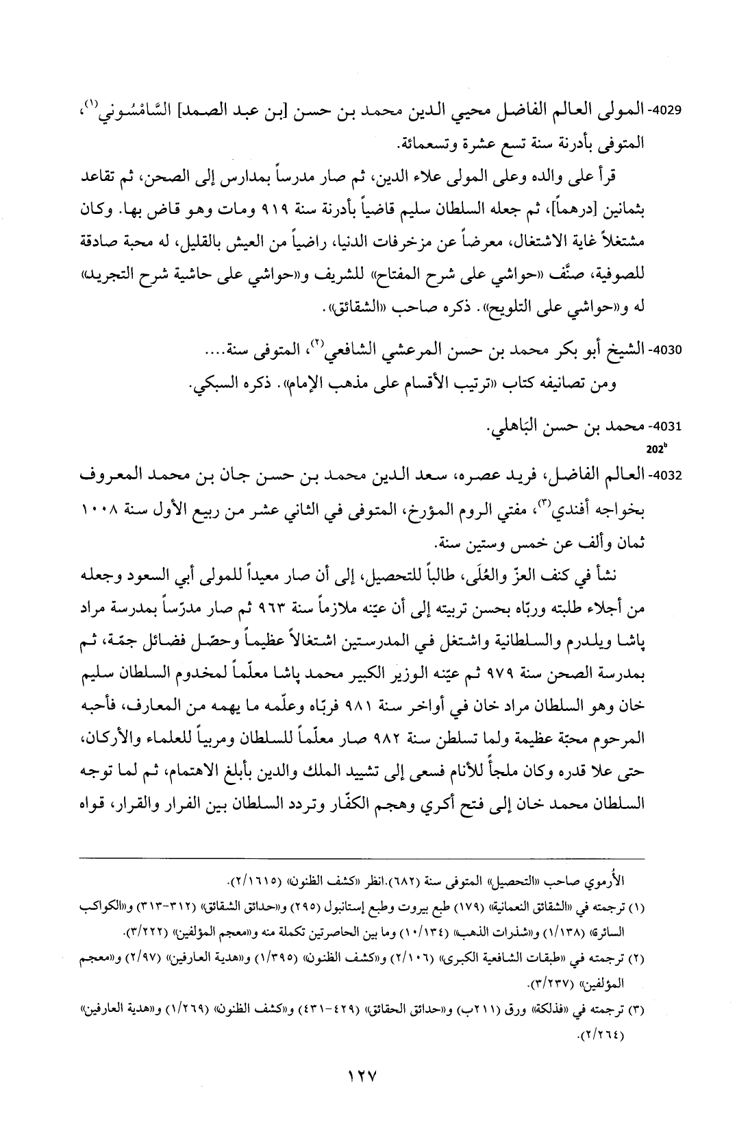 (¬1) ترجمته في "الشقائق النعمانية" (179) طبع بيروت وطبع إستانبول (295) و"حدائق الشقائق" (312 - 313) و"الكواكب السائرة" (1/ 138) و"شذرات الذهب" (10/ 134) وما بين الحاصرتين تكملة منه و"معجم المؤلفين" (3/ 222).