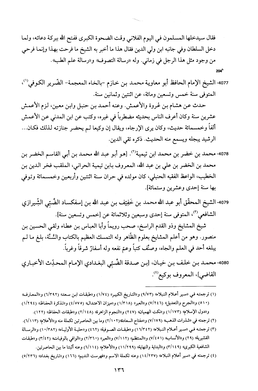 4077 - الشيخ الإمام الحافظ أبو معاوية محمد بن خازم -بالخاء المعجمة- الضّرير الكوفي (¬1)، المتوفى سنة خمس وتسعين ومائة، عن اثنتين وثمانين سنة.