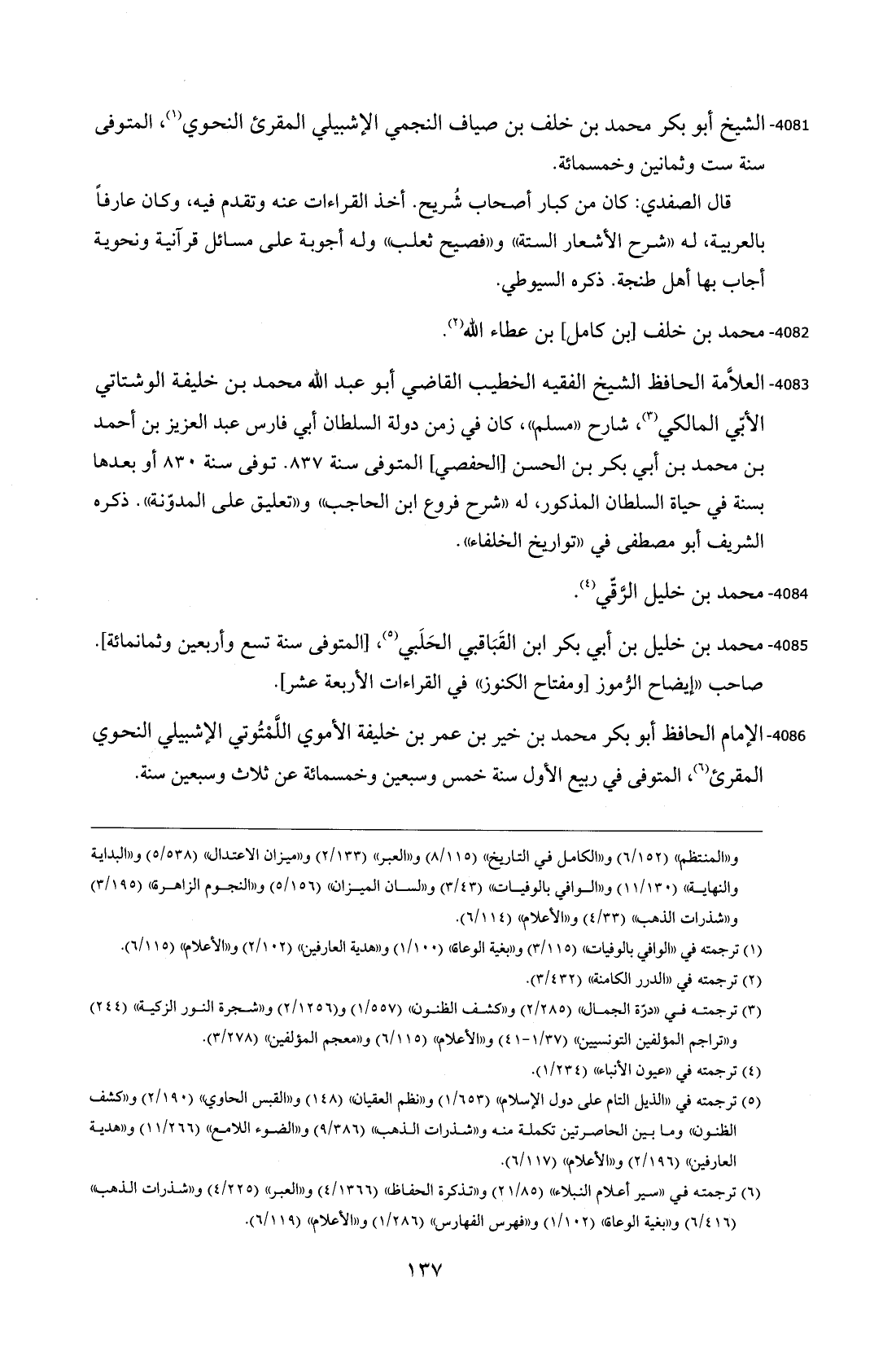 4081 - الشيخ أبو بكر محمد بن خلف بن صياف النجمي الإشبيلي المقرئ النحوي (¬1)، المتوفى سنة ست وثمانين وخمسمائة.