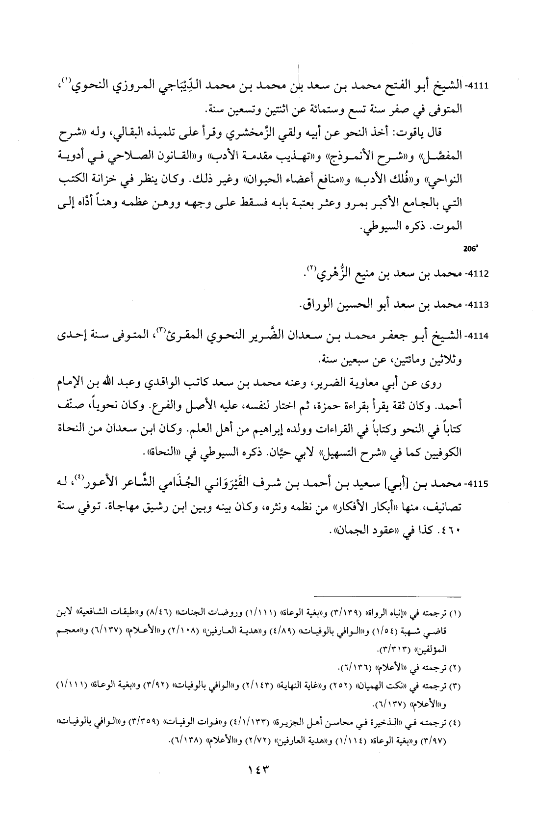4114 - الشيخ أبو جعفر محمد بن سعدان الضَّرير النحوي المقرئ (¬3)، المتوفى سنة إحدى وثلاثين ومائتين، عن سبعين سنة.