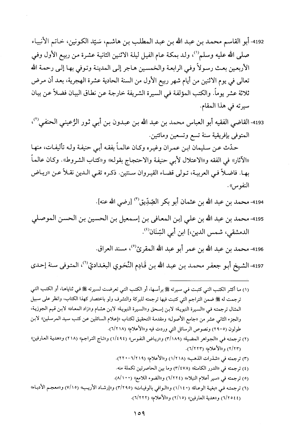 4192 - أبو القاسم محمد بن عبد الله بن عبد المطلب بن هاشم، سَيّد الكونين، خاتم الأنبياء - صلى الله عليه وسلم - (¬1)، ولد بمكة عام الفّيل ليلة الاثنين الثانية عشرة من ربيع الأول وفي الأربعين بعث رسولاً وفي الرابعة والخمسين هاجر إلى المدينة وتوفي بها إلى رحمة الله تعالى في يوم الاثنين من أيام شهر ربيع الأول من السنة الحادية عشرة الهجرية، بعد أن مرض ثلاثة عشر يوماً. والكتب المؤلفة في السيرة الشريفة خارجة عن نطاق البيان فضلاً عن بيان سيرته في هذا المقام.