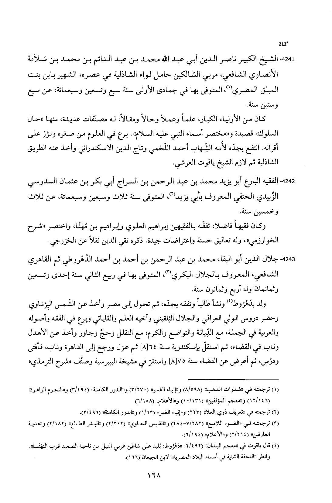 4242 - الفقيه البارع أبو يزيد محمد بن عبد الرحمن بن السراج أبي بكر بن عثمان السدوسي الزُّبيدي الحنفي المعروف بأبي يزيد (¬2)، المتوفى سنة ثلاث وسبعين وسبعمائة، عن ثلاث وخمسين سنة.