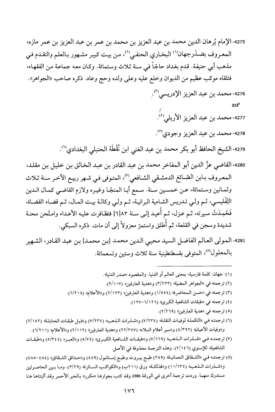 (¬8) ترجمته في "الشقائق النعمانية" (289) طبع بيروت وطبع إستانبول (489) و"حدائق الشقائق" (484 - 485) و "شذرات الذهب" (10/ 634) و"فذلكة" ورق (211 ب) و"الكواكب السائرة" (3/ 29). وما بين الحاصرتين مستدرك منهما. وردت ترجمة أخرى في الورقة b 238 وقد كتب بجوارها "مكرر" بالحبر الأحمر وقد أثبتناها هنا