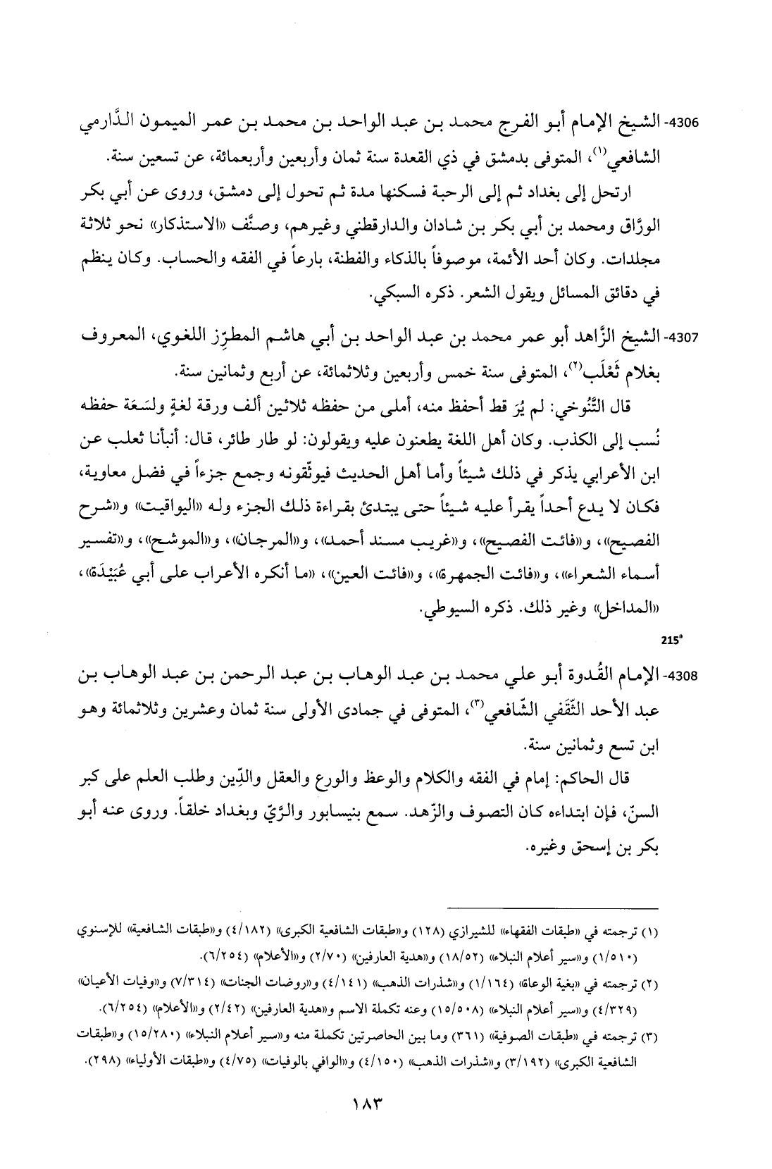 4306 - الشيخ الإمام أبو الفرج محمد بن عبد الواحد بن محمد بن عمر الميمون الدَّارمي الشافعي (¬1)، المتوفى بدمشق في ذي القعدة سنة ثمان وأربعين وأربعمائة، عن تسعين سنة.
