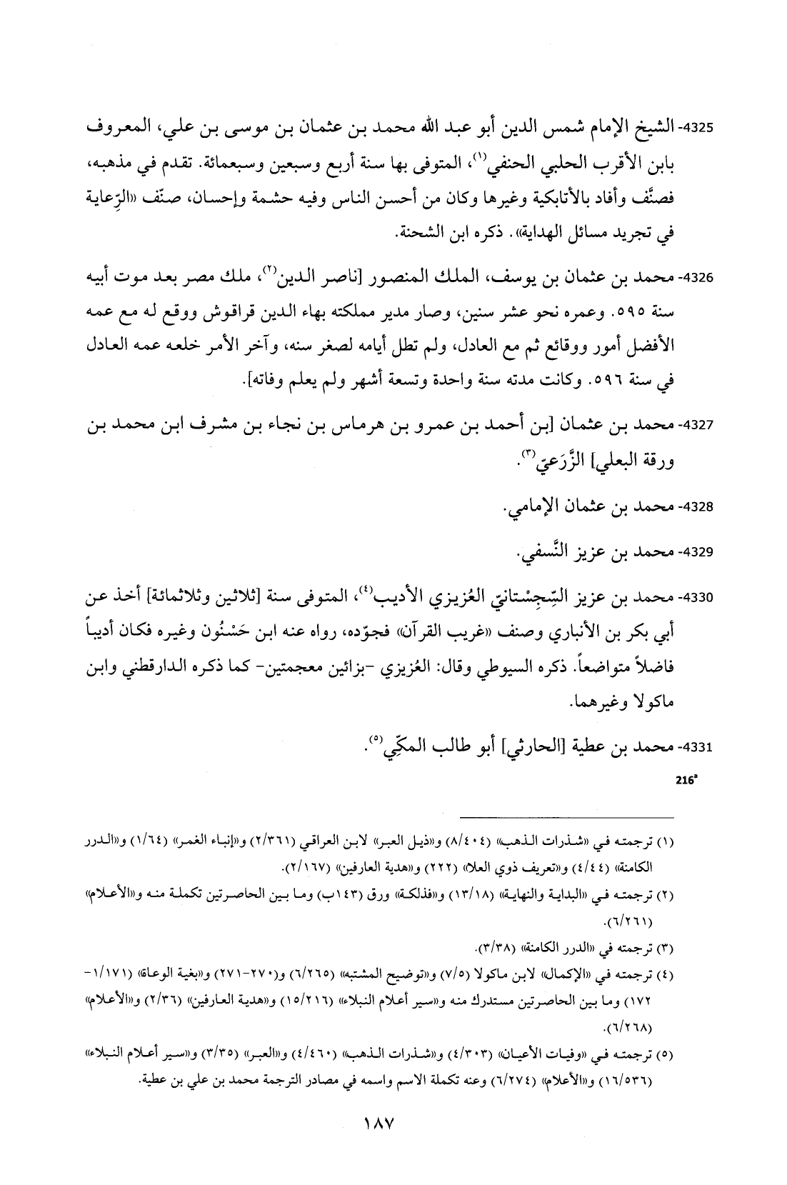 4325 - الشيخ الإمام شمس الدين أبو عبد الله محمد بن عثمان بن موسى بن علي، المعروف بابن الأقرب الحلبي الحنفي (¬1)، المتوفى بها سنة أربع وسبعين وسبعمائة. تقدم في مذهبه، فصنَّف وأفاد بالأتابكية وغيرها وكان من أحسن الناس وفيه حشمة وإحسان، صنّف "الرِّعاية في تجريد مسائل الهداية". ذكره ابن الشحنة.