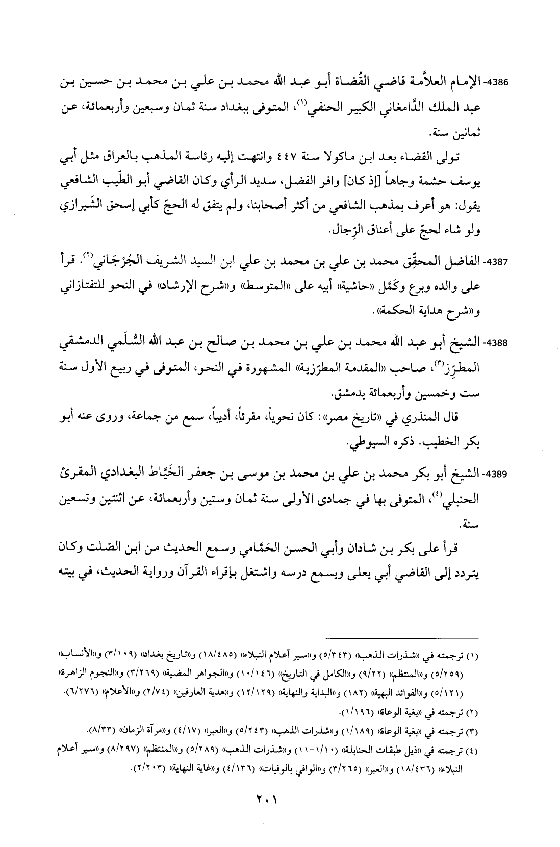 4386 - الإمام العلاَّمة قاضي القُضاة أبو عبد الله محمد بن علي بن محمد بن حسين بن عبد الملك الدَّامغاني الكبير الحنفي (¬1)، المتوفى ببغداد سنة ثمان وسبعبن وأربعمائة، عن ثمانبن سنة.
