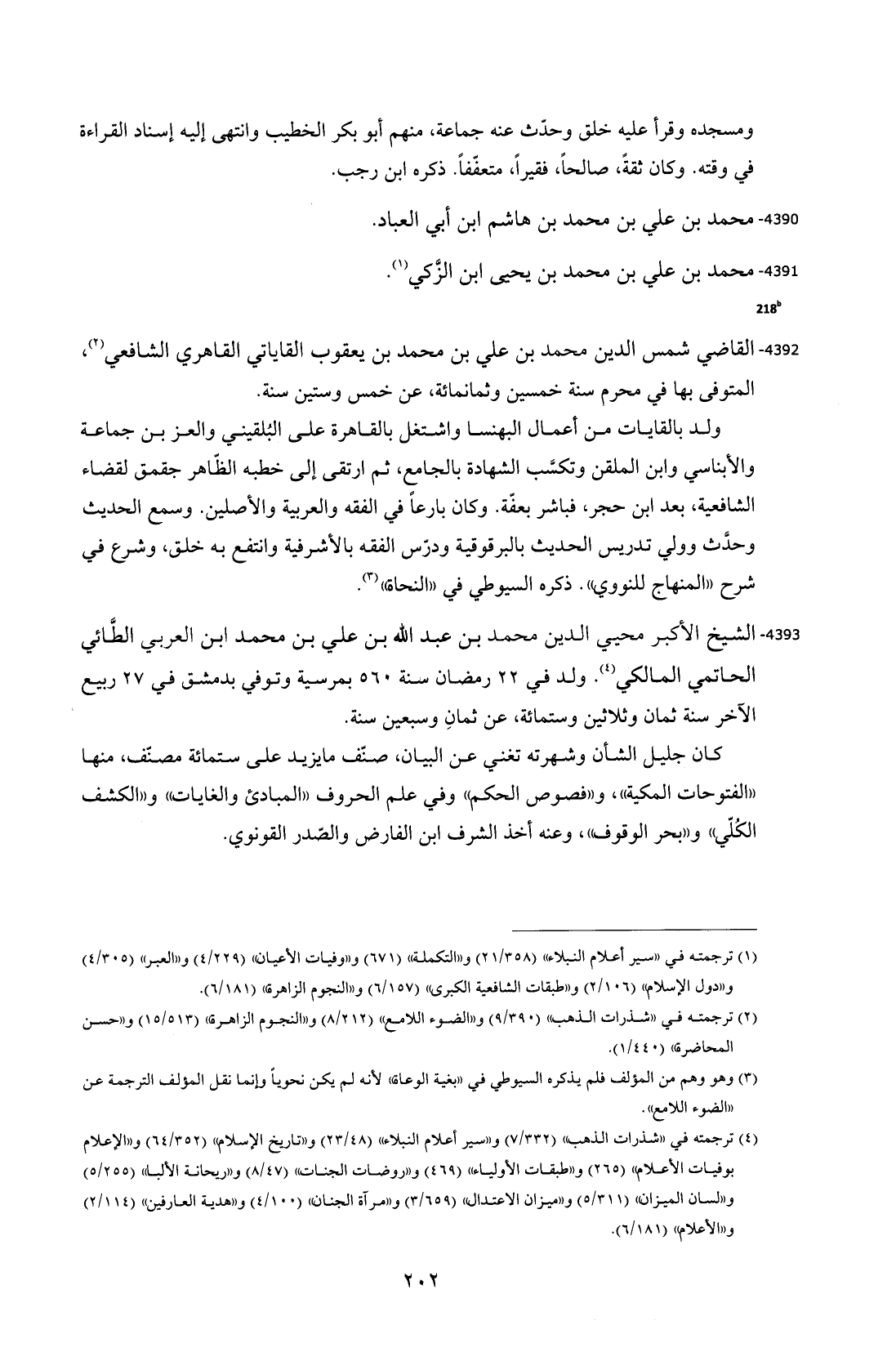 4393 - الشيخ الأكبر محيي الدين محمد بن عبد الله بن علي بن محمد ابن العربي الطَّائي الحاتمي المالكي (¬4). ولد في 22 رمضان سهنة 560 بمرسية وتوفي بدمشق في 27 ربيع الآخر سنة ثمان وثلاثين وستمائة، عن ثمانِ وسبعين سنة.
