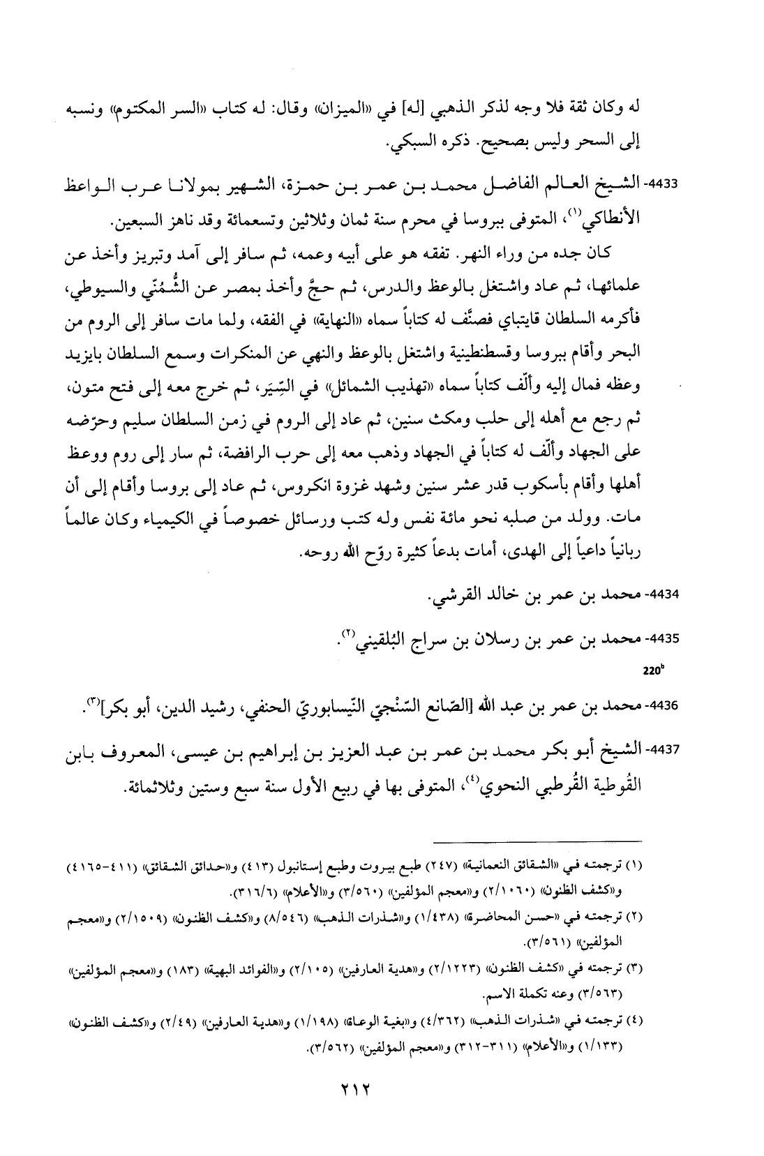 4433 - الشيخ العالم الفاضل محمد بن عمر بن حمزة، الشهير بمولانا عرب الواعظ الأنطاكي (¬1)، المتوفى ببروسا في محرم سنة ثمان وثلاثين وتسعمائة وقد ناهز السبعين.