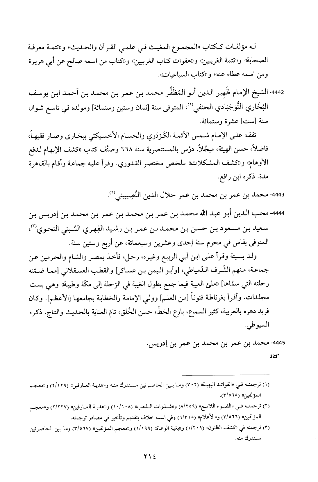 4442 - الشيخ الإمام ظَهِير الدين أبو المُظَفَّر محمد بن عمر بن محمد بن أحمد ابن يوسف البُخَاري النُّوَجَبَادي الحنفي (¬1)، المتوفى سنة [ثمان وستين وستمائة] ومولده في تاسع شوال سنة [ست] عشرة وستمائة.
