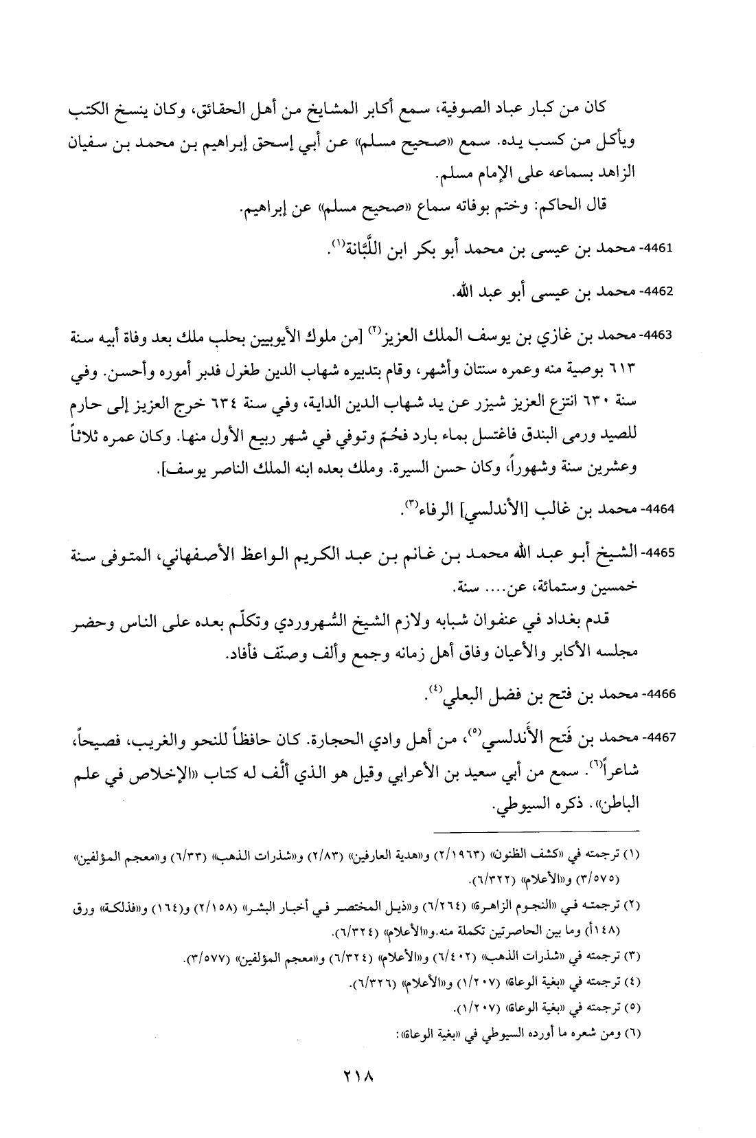 4467 - محمد بن فَتح الأَندلسي (¬5)، من أهل وادي الحجارة. كان حافظًا للنحو والغريب، فصيحًا، شاعرًا (¬6). سمع من أبي سعيد بن الأعرابي وقيل هو الذي ألَّف له كتاب "الإخلاص في علم الباطن". ذكره السيوطي.