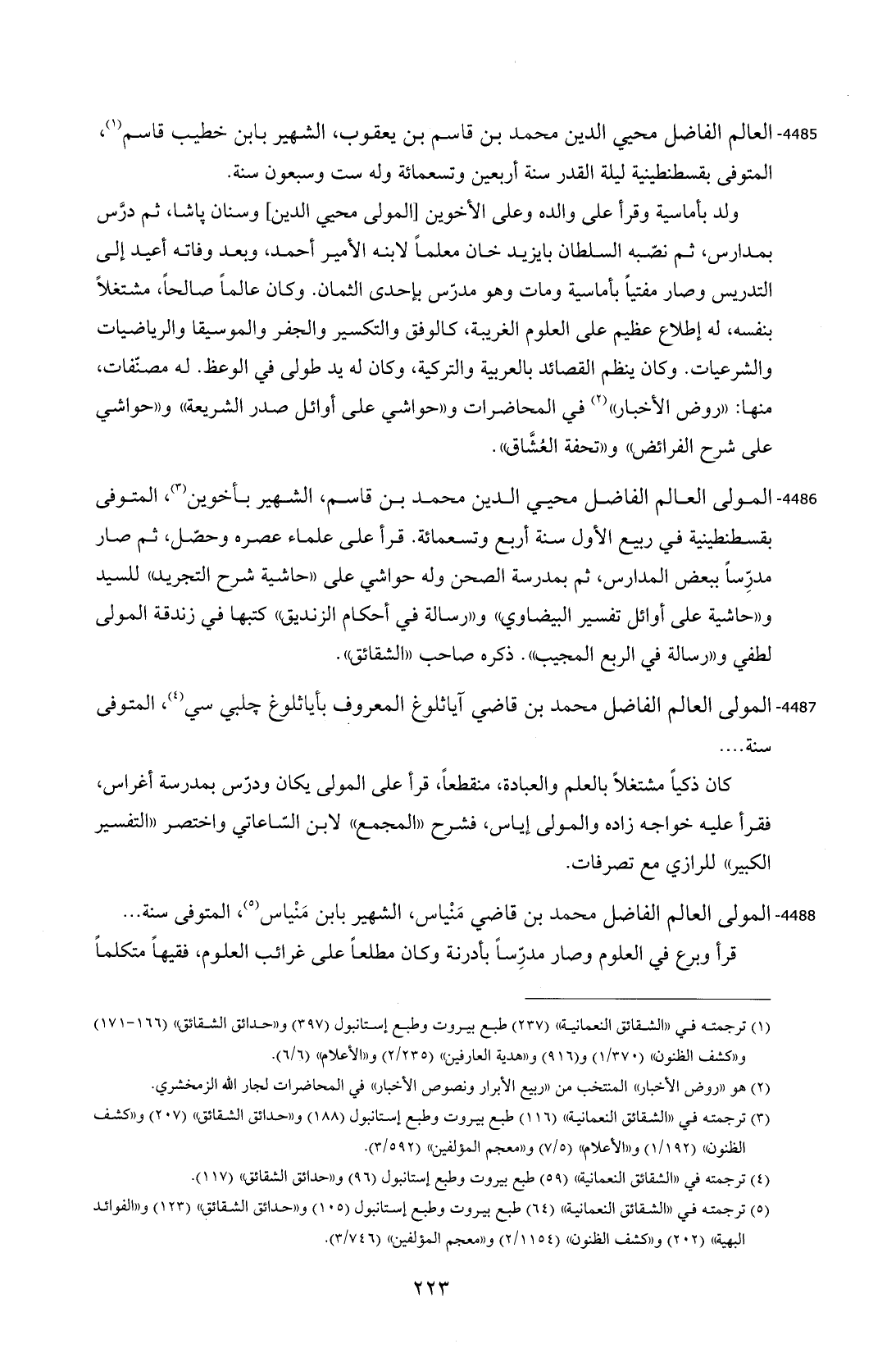4485 - العالم الفاضل محيي الدين محمد بن قاسم بن يعقوب، الشهير بابن خطيب قاسم (¬1)، المتوفى بقسطنطينية ليلة القدر سنة أربعين وتسعمائة وله ست وسبعون سنة.