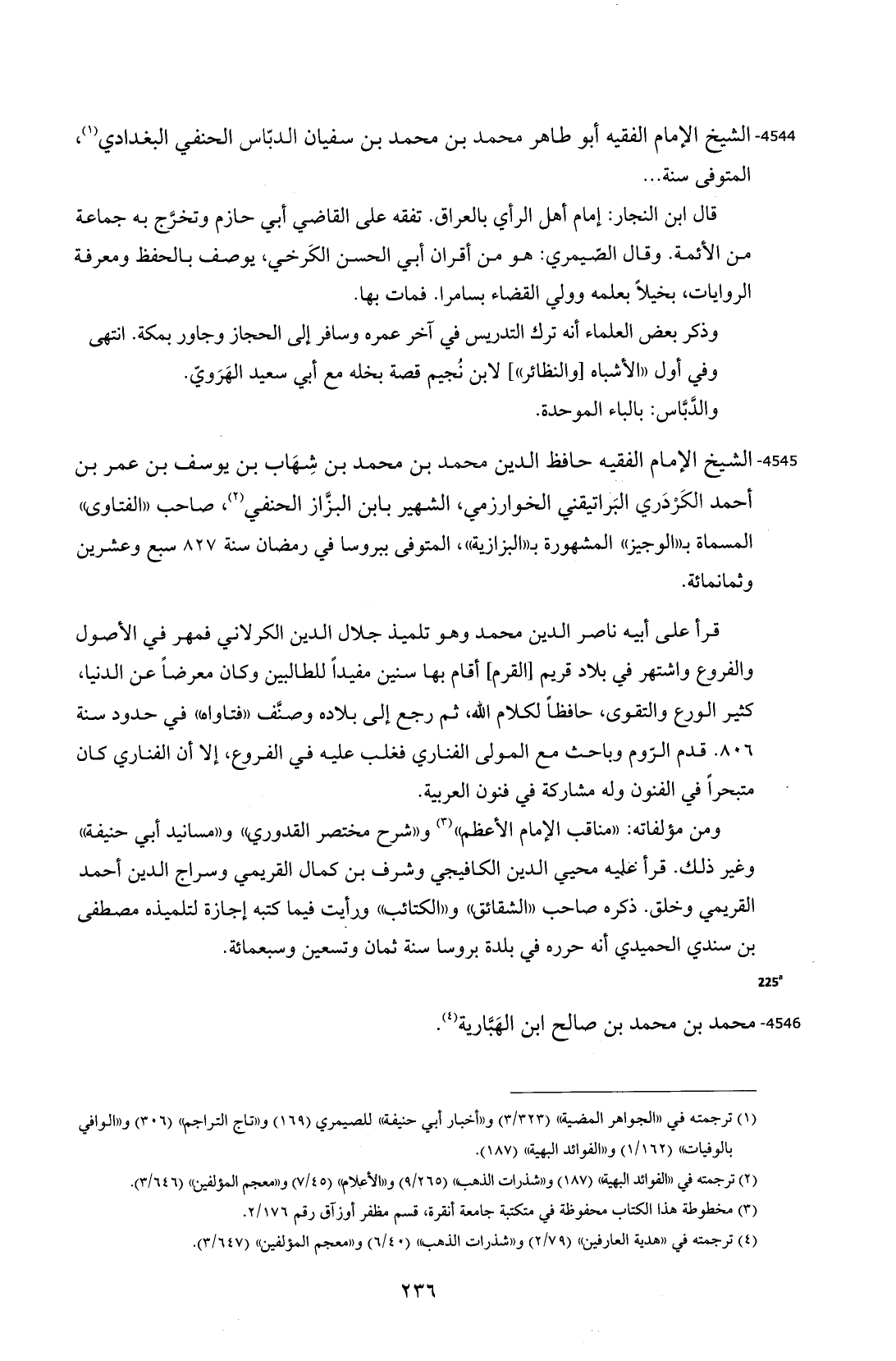 4545 - الشيخ الإمام الفقيه حافظ الدين محمد بن محمد بن شِهَاب بن يوسف بن عمر بن أحمد الكَرْدَري البَراتيقني الخوارزمي، الشهير بابن البزَّاز الحنفي (¬2)، صاحب "الفتاوى" المسماة بـ "الوجيز" المشهورة بـ "البزازية"، المتوفى ببروسا في رمضان سنة 827 سبع وعشرين وثمانمائة.