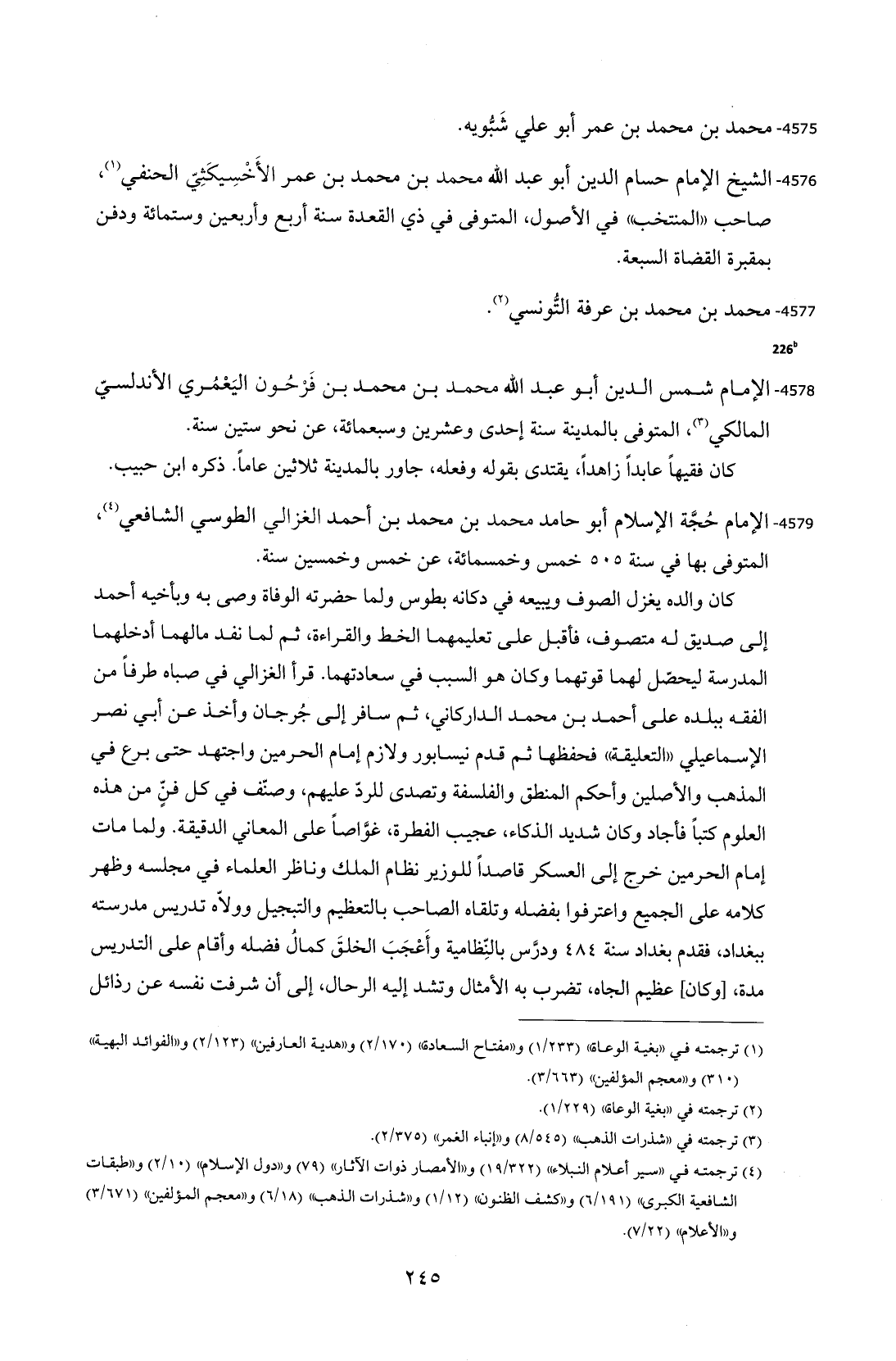 4579 - الإمام حُجَّة الإسلام أبو حامد محمد بن محمد بن أحمد الغزالي الطوسي الشافعي (¬4)، المتوفى بها في سنة 505 خمس وخمسمائة، عن خمس وخمسين سنة.