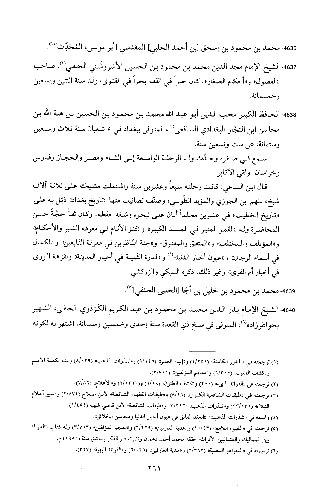 (¬5) ترجمته في "الضوء اللامع" (10/ 43) و"هدية العارفين" (2/ 229) و"معجم المؤلفين" (3/ 703) وله كتاب "العراك بين المماليك والعثمانيين الأتراك" حققه محمد أحمد دهمان ونشرته دار الفكر بدمشق سنة (1986) م.