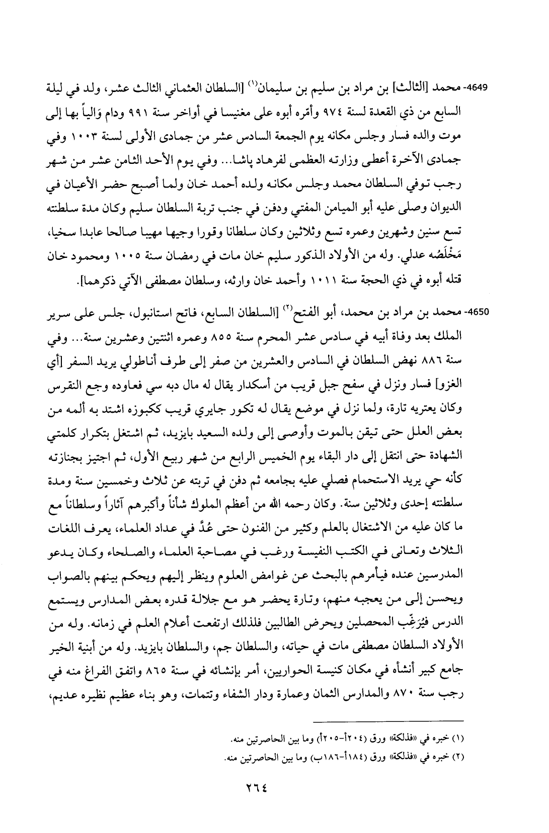 4650 - محمد بن مراد بن محمد، أبو الفتح (¬2) [السلطان السابع، فاتح إستانبول، جلس على سرير الملك بعد وفاة أبيه في سادس عشر المحرم سنة 855 وعمره اثنتين وعشرين سنة ... وفي سنة 886 نهض السلطان في السادس والعشرين من صفر إلى طرف أناطولي يريد السفر [أي الغزو] فسار ونزل في سفح جبل قريب من أسكدار يقال له مال دبه سي فعاوده وجع النقرس وكان يعتريه تارة، ولما نزل في موضع يقال له تكور جايري قريب ككبوزه اشتد به ألمه من بعض العلل حتى تيقن بالموت وأوصى إلى ولده السعيد بايزيد، ثم اشتغل بتكرار كلمتي الشهادة حتى انتقل إلى دار البقاء يوم الخميس الرابع من شهر ربيع الأول، ثم اجتيز بجنازته كأنه حي يريد الاستحمام فصلي عليه بجامعه ثم دفن في تربته عن ثلاث وخمسين سنة ومدة سلطنته إحدى وثلاثين سنة. وكان رحمه الله من أعظم الملوك شأناً وأكبرهم آثاراً وسلطاناً مع ما كان عليه من الاشتغال بالعلم وكثير من الفنون حتى عُدَّ في عداد العلماء، يعرف اللغات الثلاث وتعانى في الكتب النفيسة ورغب في مصاحبة العلماء والصلحاء وكان يدعو المدرسين عنده فيأمرهم بالبحث عن غوامض العلوم وينظر إليهم ويحكم بينهم بالصواب ويحسن إلى من يعجبه منهم، وتارة يحضر هو مع جلالة قدره بعض المدارس ويستمع الدرس فيُرَغِّب المحصلين ويحرض الطالبين فلذلك ارتفعت أعلام العلم في زمانه. وله من الأولاد السلطان مصطفى مات في حياته، والسلطان جم، والسلطان بايزيد. وله من أبنية الخير جامع كبير أنشأه في مكان كنيسة الحواريين، أمر بإنشائه في سنة 865 واتفق الفراغ منه في رجب سنة 870 والمدارس الثمان وعمارة ودار الشفاء وتتمات، وهو بناء عظيم نظيره عديم،