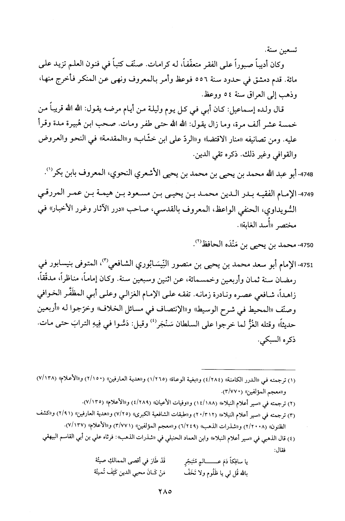 4751 - الإمام أبو سعد محمد بن يحيى بن منصور النِّيسَابُوري الشافعي (¬3)، المتوفى بنيسابور في رمضان سنة ثمان وأربعين وخمسمائة، عن اثنين وسبعين سنة. وكان إماماً، مناظراً، مدقّقاً، زاهداً، شافعي عصره ونادرة زمانه. تفقه على الإمام الغزالي وعلى أبي المظَفَّر الخوافي وصنّف "المحيط في شرح الوسيط" و"الإنتصاف في مسائل الخلاف" وخرّجوا له "أربعين حديثاً" وقتله الغُزُّ لما خرجوا على السلطان سَنْجَر (¬4) وقيل: دَسُّوا في فِيهِ الترابَ حتى مات. ذكره السبكي.
