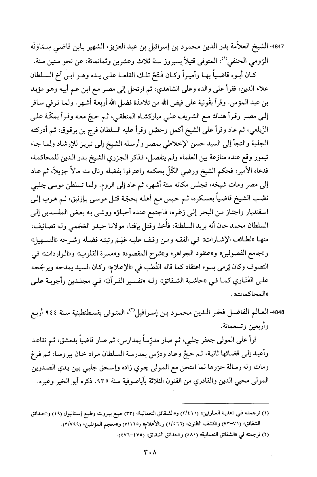 4847 - الشيخ العلاّمة بدر الدين محمود بن إسرائيل بن عبد العزيز، الشهير بابن قاضي سِمَاوْنَه الرّومي الحنفي (¬1)، المتوفى قتيلاً بسيروز سنة ثلاث وعشرين وثمانمائة، عن نحو ستين سنة. كان أبوه قاضياً بها وأميراً وكان فَتْحُ تلك القلعة على يده وهو ابن أخ السلطان علاء الدين، فقرأ على والده وعلى الشاهدي، ثم ارتحل إلى مصر مع ابن عم أبيه وهو مؤيد بن عبد المؤمن. وقرأ بقُونية على فيض الله من تلامذة فضل الله أربعة أشهر. ولما توفي سافر إلى مصر وقرأ هناك مع الشريف علي مباركشاه المنطقي، ثم حجّ معه وقرأ بمكّة على الزّيلعي، ثم عاد وقرأ على الشيخ أكمل وحصَّل وقرأ عليه السلطان فرج بن برقوق، ثم أدركته الجذبة والتجأ إلى السيد حسن الإخلاطي بمصر وأرسله الشيخ إلى تبريز للإرشاد ولما جاء تيمور وقع عنده منازعة بين العلماء ولم ينفصل، فذكر الجزري الشيخ بدر الدين للمحاكمة، فدعاه الأمير، فحكم الشيخ ورضي الكُلّ بحكمه واعترفوا بفضله ونال منه مالاً جزيلاً، ثم عاد إلى مصر ومات شيخه، فجلس مكانه ستة أشهر، ثم عاد إلى الروم. ولما تسلطن موسى جلبي نصَّب الشيخ قاضياً بعسكره، ثم حبس مع أهله بحجّة قتل موسى بإزنيق، ثم هرب إلى اسفنديار واجتاز من البحر إلى زغره، فاجتمع عنده أحباؤه ووشى به بعض المفسدين إلى السلطان محمد خان أنه يريد السلطنة، فأُخذ وقتل بإفتاء مولانا حيدر العَجَمي وله تصانيف، منها "لطائف الإشارات" في الفقه ومن وقف عليه عَلِمَ رتبته فضله وشرحه "التسهيل" و"جامع الفصولين" و"عنقود الجواهر" و"شرح المقصود" و"مسرة القلوب" و"الواردات" في التصوف وكان يُرمى بسوء اعتقاد كما قاله القُطب في "الإعلام" وكان السيد يمدحه ويرجّحه على الفَنَاري كما في "حاشية الشقائق" وله "تفسير القرآن" في مجلدين وأجوبة على "المحاكمات".