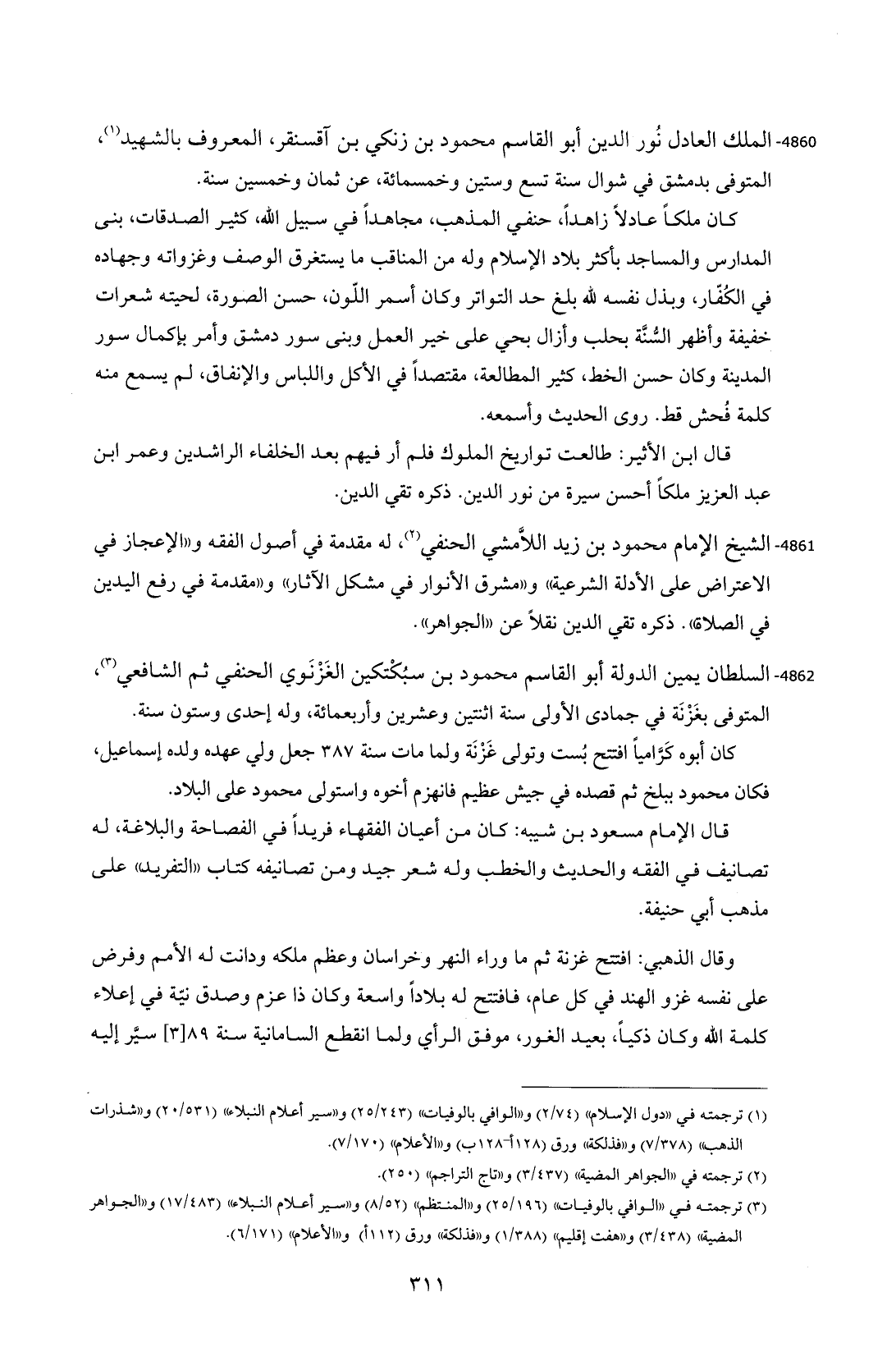 4860 - الملك العادل نُور الدين أبو القاسم محمود بن زنكي بن آقسنقر، المعروف بالشهيد (¬1)، المتوفى بدمشق في شوال سنة تسع وستين وخمسمائة، عن ثمان وخمسين سنة.