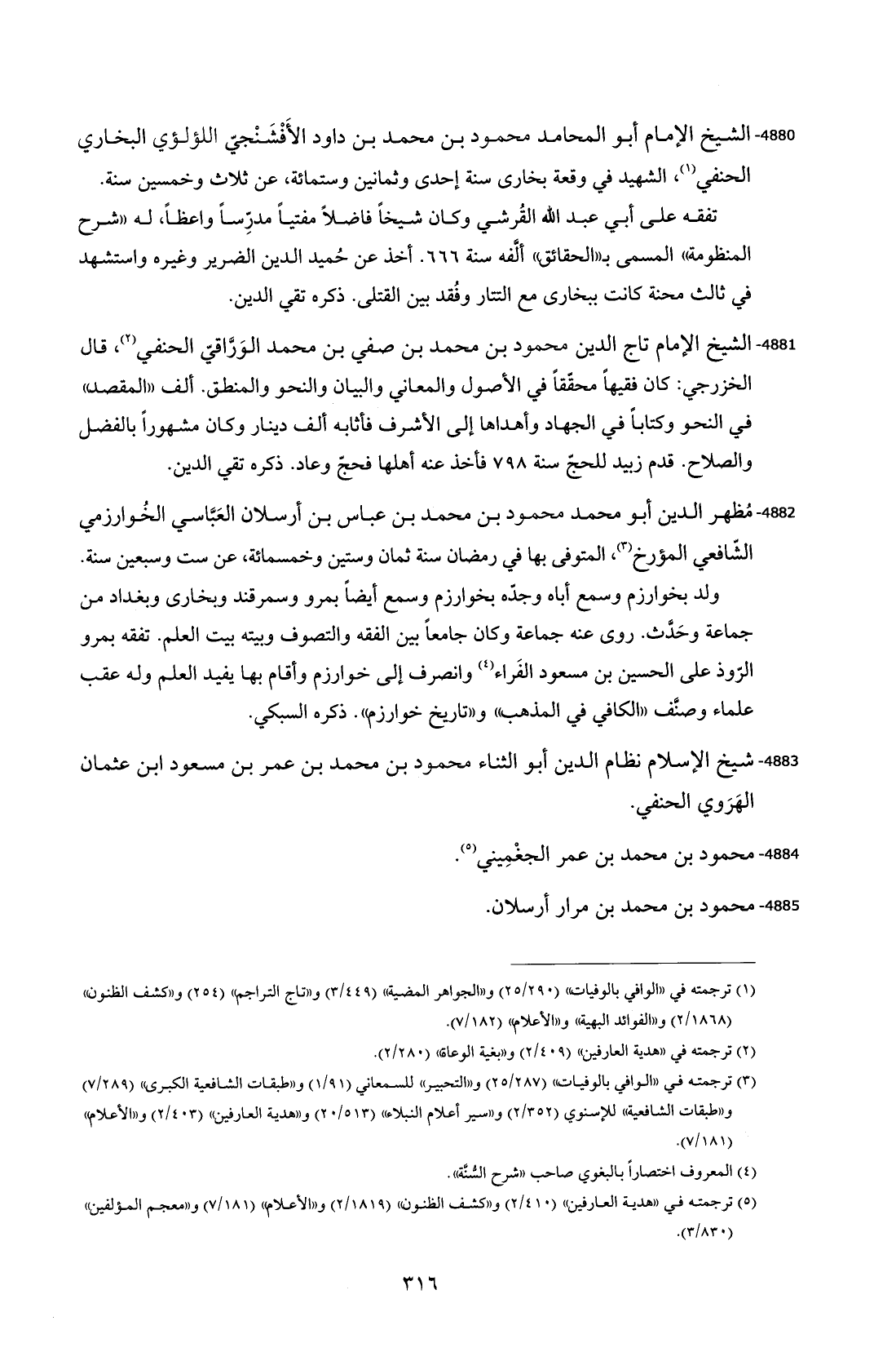 4880 - الشيخ الإمام أبو المحامد محمود بن محمد بن داود الأَفْشَنْجيّ اللؤلؤي البخاري الحنفي (¬1)، الشهيد في وقعة بخارى سنة إحدى وثمانين وستمائة، عن ثلاث وخمسين سنة. تفقه على أبي عبد الله القُرشي وكان شيخًا فاضلاً مفتيًا مدرِّسًا واعظًا، له "شرح المنظومة" المسمى بـ"الحقائق" ألَّفه سنة 666. أخذ عن حُميد الدين الضرير وغيره واستشهد في ثالث محنة كانت ببخارى مع التتار وفُقد بين القتلى. ذكره تقي الدين.