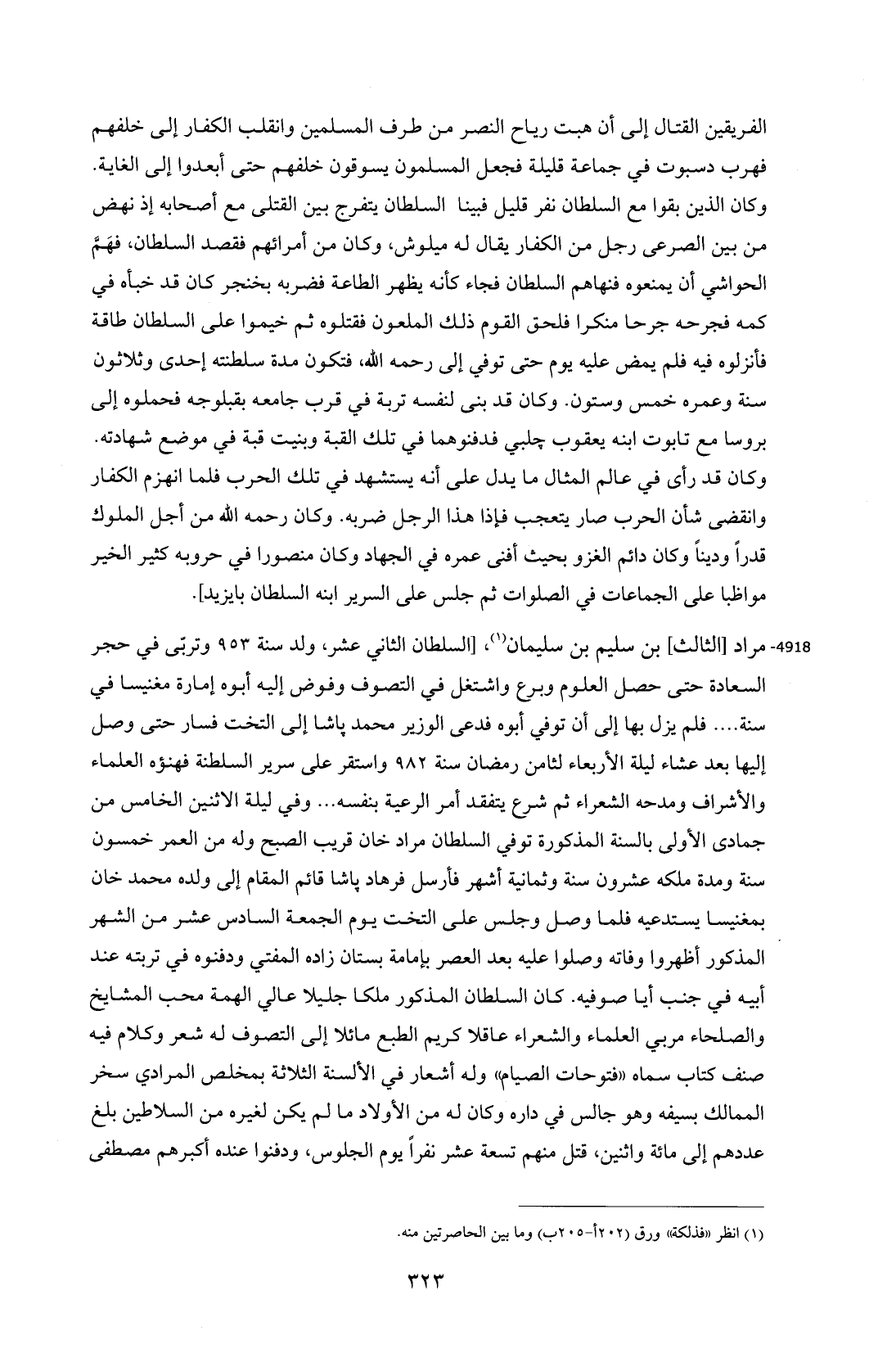 4918 - مراد [الثالث] بن سليم بن سليمان (¬1)، [السلطان الثاني عشر، ولد سنة 953 وتربّى في حجر السعادة حتى حصل العلوم وبرع واشتغل في التصوف وفوض إليه أبوه إمارة مغنيسا في سنة .... فلم يزل بها إلى أن توفي أبوه فدعى الوزير محمد باشا إلى التخت فسار حتى وصل إليها بعد عشاء ليلة الأربعاء لثامن رمضان سنة 982 واستقر على سرير السلطنة فهنؤه العلماء والأشراف ومدحه الشعراء ثم شرع يتفقد أمر الرعية بنفسه ... وفي ليلة الاثنين الخامس من جمادى الأولى بالسنة المذكورة توفي السلطان مراد خان قريب الصبح وله من العمر خمسون سنة ومدة ملكه عشرون سنة وثمانية أشهر فأرسل فرهاد باشا قائم المقام إلى ولده محمد خان بمغنيسا يستدعيه فلما وصل وجلس على التخت يوم الجمعة السادس عشر من الشهر المذكور أظهروا وفاته وصلوا عليه بعد العصر بإمامة بستان زاده المفتي ودفنوه في تربته عند أبيه في جنب أيا صوفيه. كان السلطان المذكور ملكا جليلا عالي الهمة محب المشايخ والصلحاء مربي العلماء والشعراء عاقلا كريم الطبع مائلا إلى التصوف له شعر وكلام فيه صنف كتاب سماه "فتوحات الصيام" وله أشعار في الألسنة الثلاثة بمخلص المرادي سخر الممالك بسيفه وهو جالس في داره وكان له من الأولاد ما لم يكن لغيره من السلاطين بلغ عددهم إلى مائة واثنين، قتل منهم تسعة عشر نفرًا يوم الجلوس، ودفنوا عنده أكبرهم مصطفى