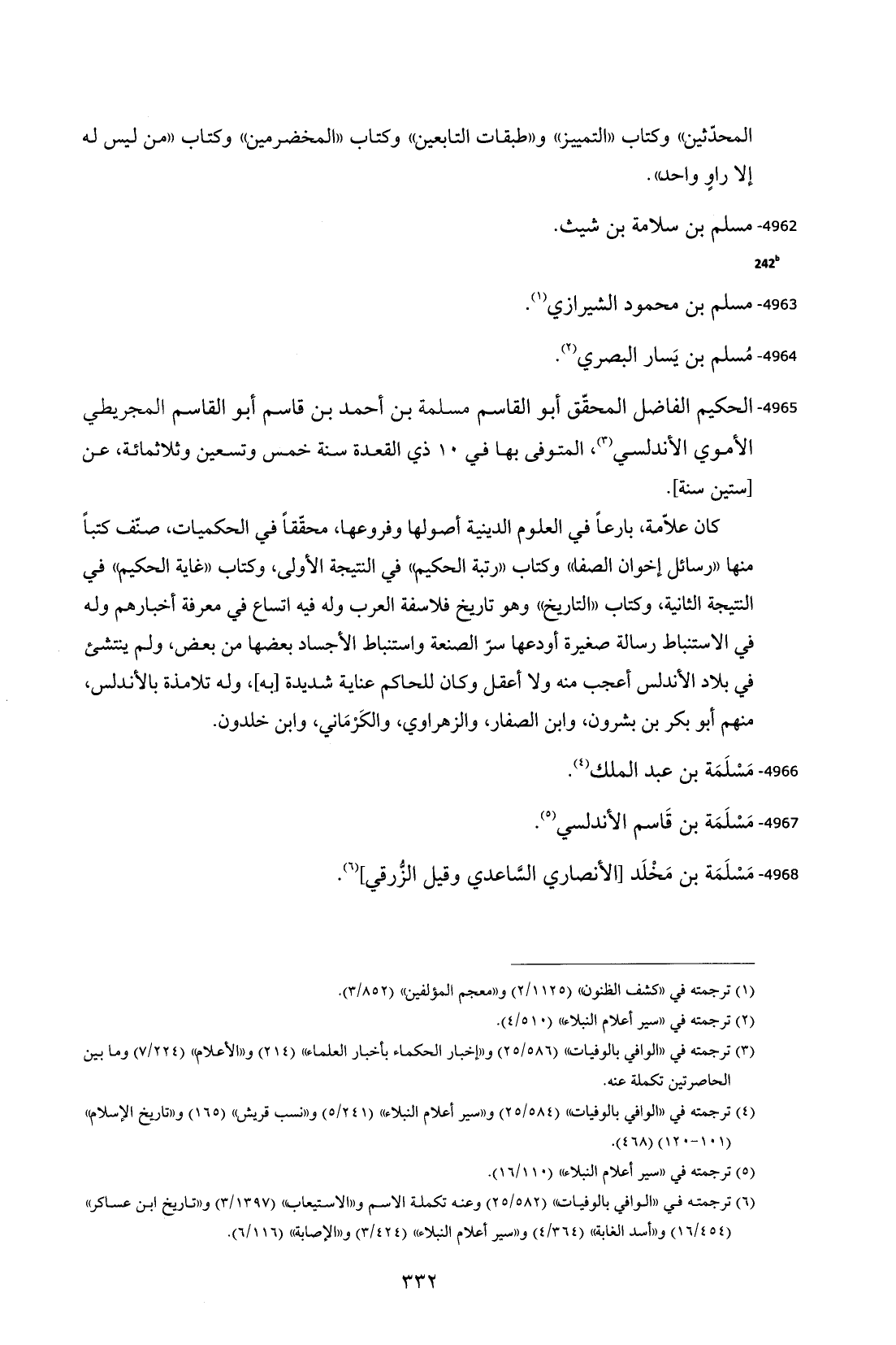 4965 - الحكيم الفاضل المحقّق أبو القاسم مسلمة بن أحمد بن قاسم أبو القاسم المجريطي الأموي الأندلسي (¬3)، المتوفى بها في 10 ذي القعدة سنة خمس وتسعين وثلاثمائة، عن [ستين سنة].