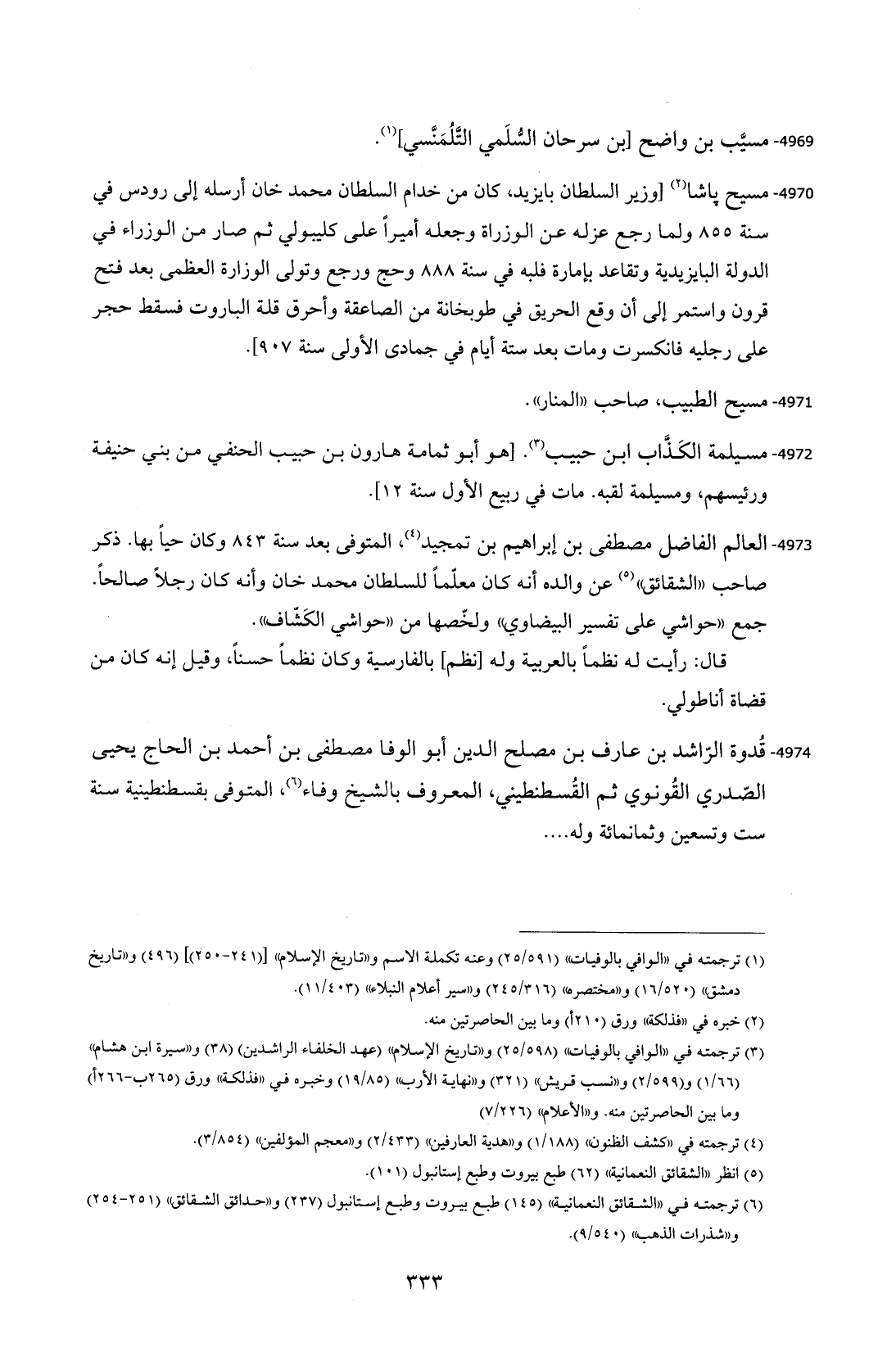 4973 - العالم الفاضل مصطفى بن إبراهيم بن تمجيد (¬4)، المتوفى بعد سنة 843 وكان حيًا بها. ذكر صاحب "الشقائق" (¬5) عن والده أنه كان معلّمًا للسلطان محمد خان وأنه كان رجلًا صالحًا. جمع "حواشي على تفسير البيضاوي" ولخّصها من "حواشي الكَشّاف".