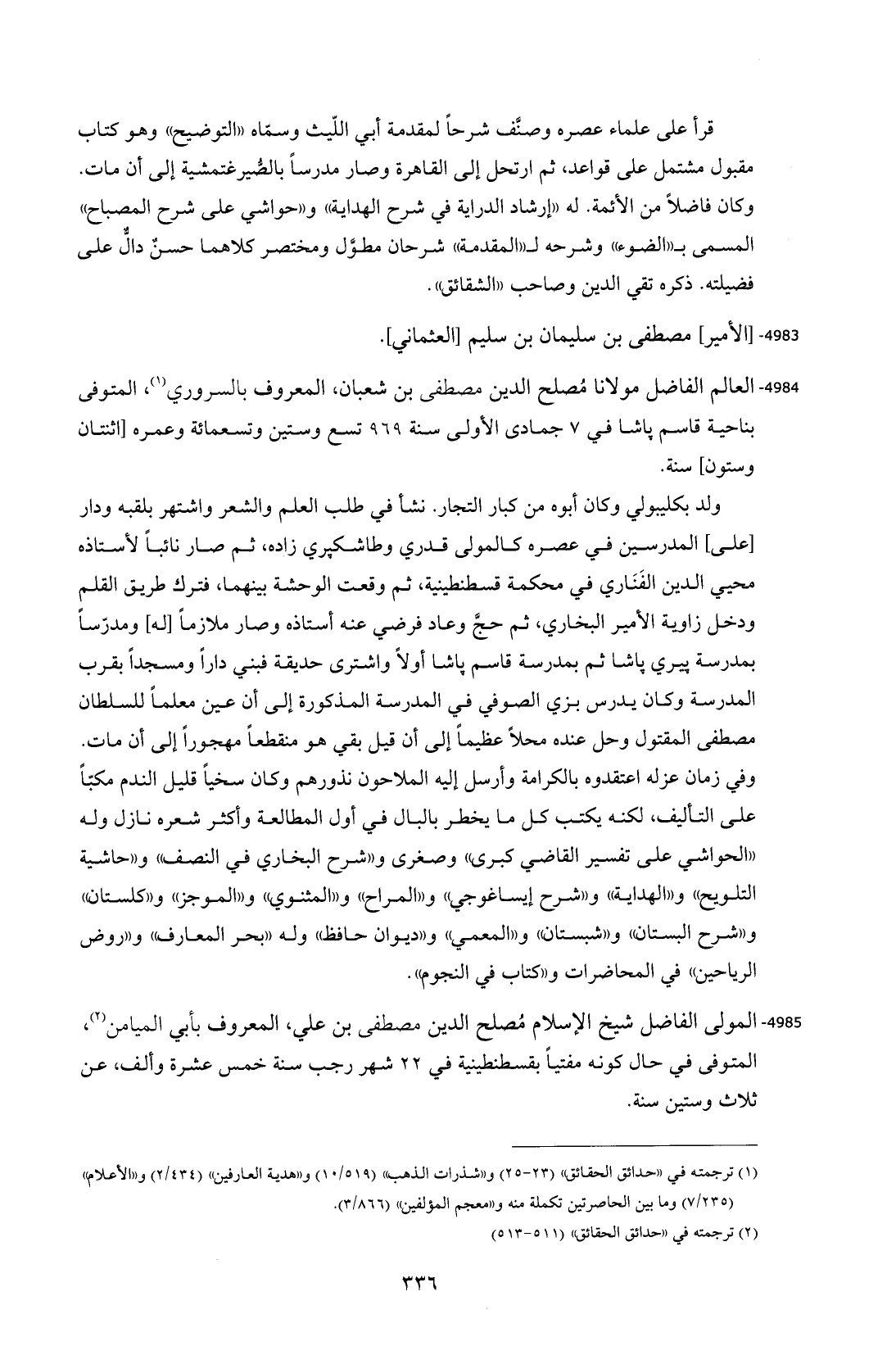 4985 - المولى الفاضل شيخ الإسلام مُصلح الدين مصطفى بن علي، المعروف بأبي الميامن (¬2)، المتوفى في حال كونه مفتيًا بقسطنطينية في 22 شهر رجب سنة خمس عشرة وألف، عن ثلاث وستين سنة.