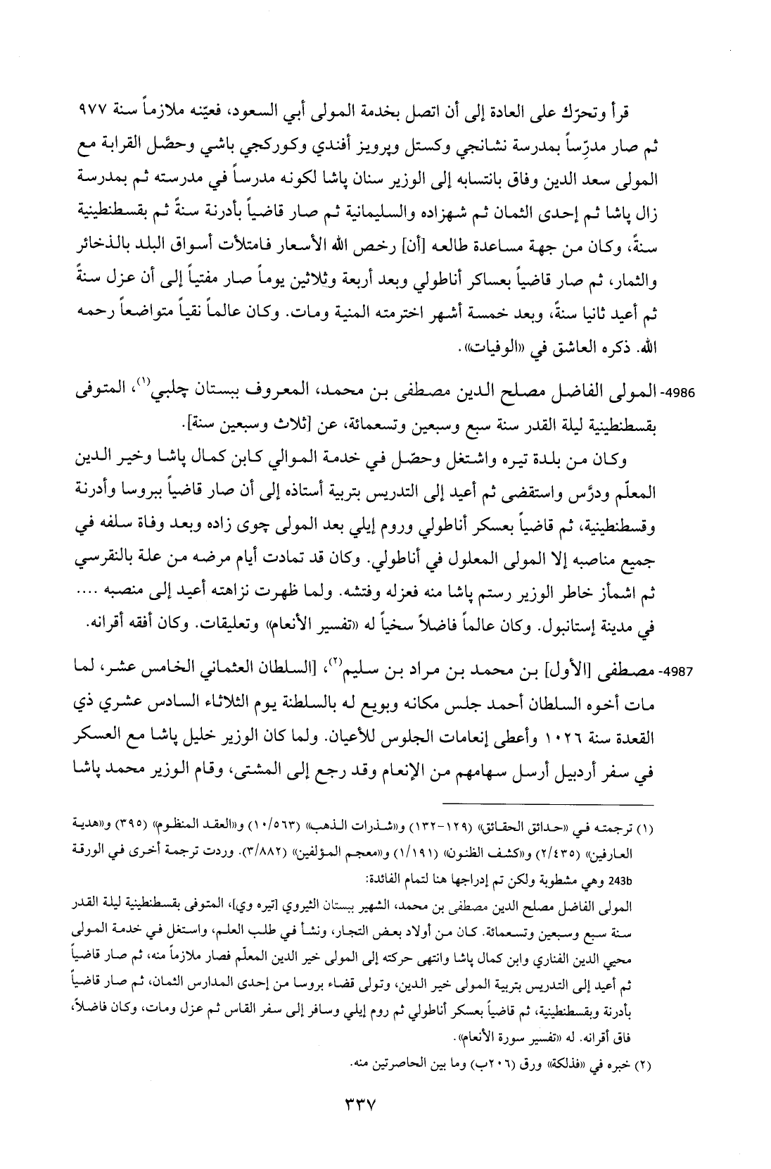 4986 - المولى الفاضل مصلح الدين مصطفى بن محمد، المعروف ببستان جلبي (¬1)، المتوفى بقسطنطينية ليلة القدر سنة سبع وسبعين وتسعمائة، عن [ثلاث وسبعين سنة].