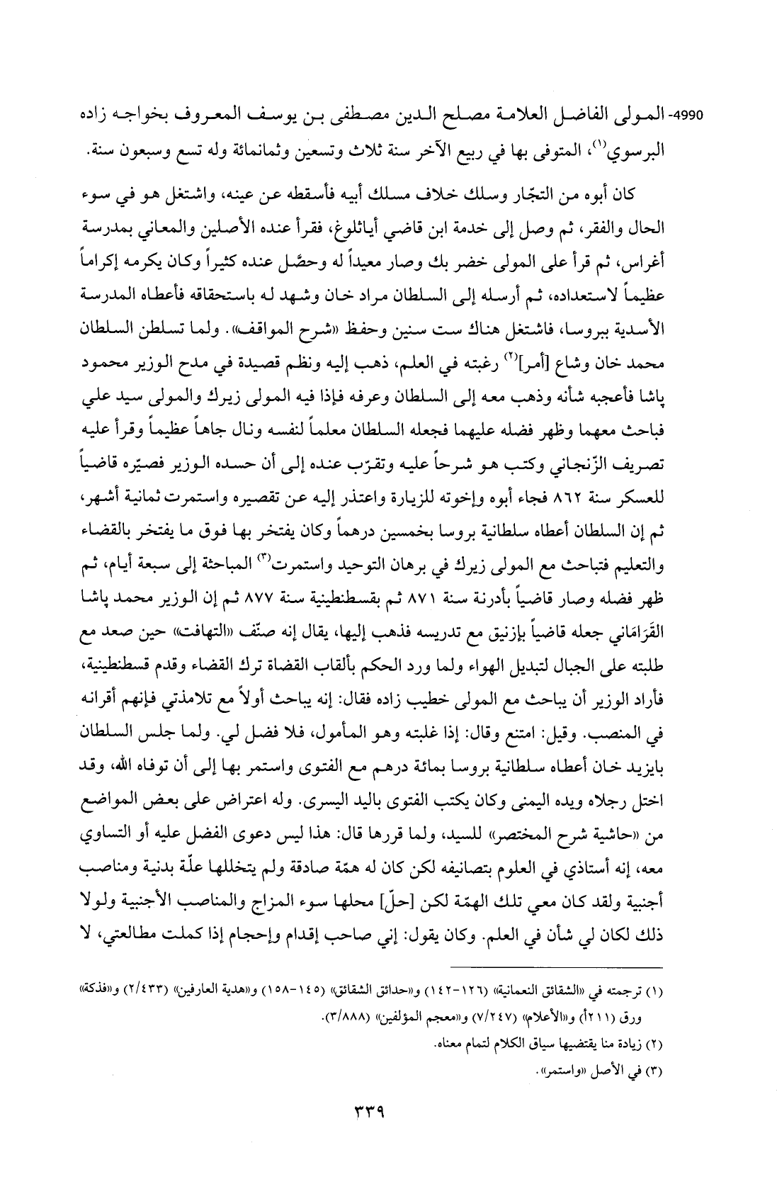 4990 - المولى الفاضل العلامة مصلح الدين مصطفى بن يوسف المعروف بخواجه زاده البرسوي (¬1)، المتوفى بها في ربيع الآخر سنة ثلاث وتسعين وثمانمائة وله تسع وسبعون سنة.