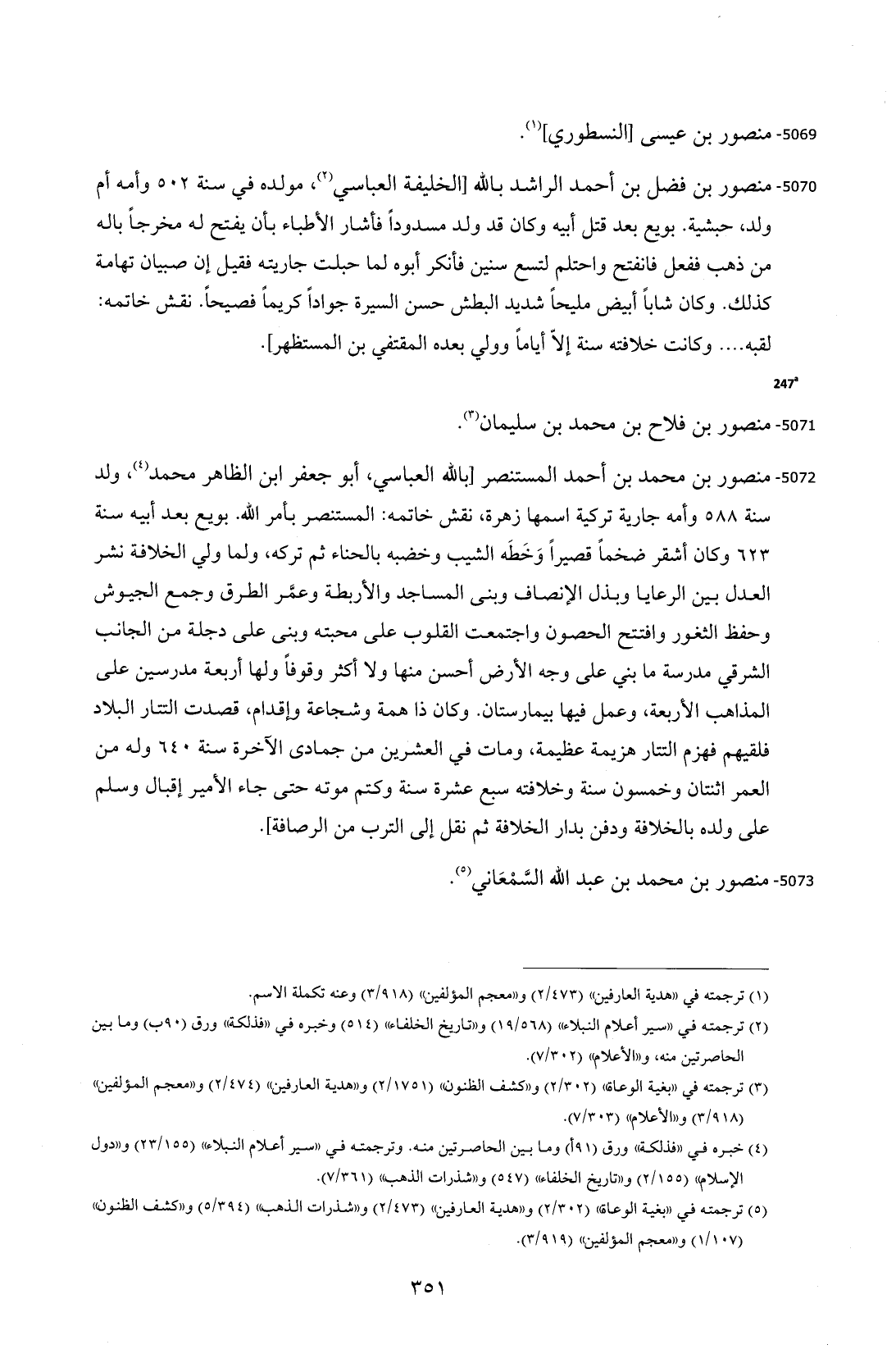 5072 - منصور بن محمد بن أحمد المستنصر [بالله العباسي، أبو جعفر ابن الظاهر محمد (¬4)، ولد سنة 588 وأمه جارية تركية اسمها زهرة، نقش خاتمه: المستنصر بأمر الله. بويع بعد أبيه سنة 623 وكان أشقر ضخمًا قصيرًا وَخَطَه الشيب وخضبه بالحناء ثم تركه، ولما ولي الخلافة نشر العدل بين الرعايا وبذل الإنصاف وبنى المساجد والأربطة وعمَّر الطرق وجمع الجيوش وحفظ الثغور وافتتح الحصون واجتمعت القلوب على محبته وبنى على دجلة من الجانب الشرقي مدرسة ما بني على وجه الأرض أحسن منها ولا أكثر وقوفًا ولها أربعة مدرسين على المذاهب الأربعة، وعمل فيها بيمارستان. وكان ذا همة وشجاعة وإقدام، قصدت التتار البلاد فلقيهم فهزم التتار هزيمة عظيمة، ومات في العشرين من جمادى الآخرة سنة 640 وله من العمر اثنتان وخمسون سنة وخلافته سبع عشرة سنة وكتم موته حتى جاء الأمير إقبال وسلم على ولده بالخلافة ودفن بدار الخلافة ثم نقل إلى الترب من الرصافة].