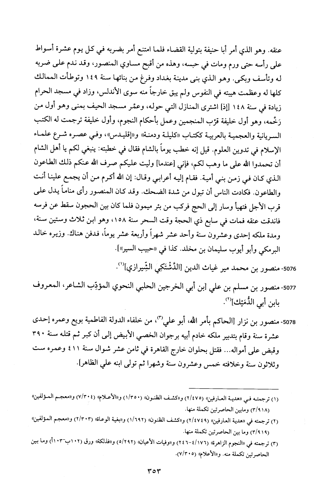 عنقه. وهو الذي أمر أبا حنيفة بتولية القضاء فلما امتنع أمر بضربه في كل يوم عشرة أسواط على رأسه حتى ورم ومات في حبسه، وهذه من أقبح مساوي المنصور، وقد ندم على ضربه له وتأسف وبكى. وهو الذي بنى مدينة بغداد وفرغ من بنائها سنة 149 وتوطأت الممالك كلها له وعظمت هيبته في النفوس ولم يبق خارجًا منه سوى الأندلس، وزاد في مسجد الحرام زيادة في سنة 148 [إذ] اشترى المنازل التي حوله، وعمَّر مسجد الحيف بمنى وهو أول من رَخَّمه، وهو أول خليفة قرْب المنجمين وعمل بأحكام النجوم، وأول خليفة ترجمت له الكتب السريانية والعجمية بالعربية ككتاب "كليلة ودمنة" و"إقليدس"، وفي عصره شرع علماء الإسلام في تدوين العلوم. قيل إنه خطب يومًا بالشام فقال في خطبته: ينبغي لكم يا أهل الشام أن تحمدوا الله على ما وهب لكم، فإني [عندما] وليت عليكم صرف الله عنكم ذلك الطاعون الذي كان في زمن بني أمية. فقام إليه أعرابي وقال: إن الله أكرم من أن يجمع علينا أنت والطاعون. فكادت الناس أن تبول من شدة الضحك. وقد كان المنصور رأى منامًا يدل على قرب الأجل فتهيأ وسار إلى الحج فركب من بئر ميمون فلما كان بين الحجون سقط عن فرسه فاندقت عنقه فمات في سابع ذي الحجة وقت السحر سنة 158، وهو ابن ثلاث وستين سنة، ومدة ملكه إحدى وعشرون سنة وأحد عشر شهرًا وأربعة عشر يومًا، فدفن هناك. وزيره خالد البرمكي وأبو أيوب سليمان بن مخلد. كذا في "حبيب السير"].