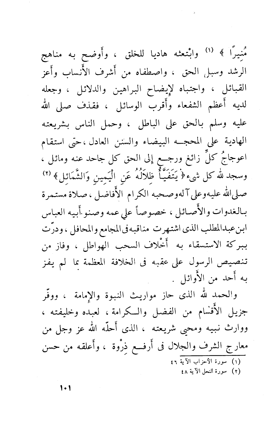 وابتعثه هاديا لِلْخلقِ وأوضح بِهِ مناهج الرشد وسبل الْحق واصطفاه من أشرف الْأَنْسَاب وأعز الْقَبَائِل واجتباه لإيضاح الْبَرَاهِين والدلائل وَجعله لَدَيْهِ أعظم الشفعاء وَأقرب الْوَسَائِل فقذف صلى الله عَلَيْهِ وَسلم بِالْحَقِّ على الْبَاطِل وَحمل النَّاس بِشَرِيعَتِهِ الهادية على المحجة الْبَيْضَاء وَالسّنَن الْعَادِل حَتَّى استقام اعوجاج كل زائغ وَرجع إِلَى الْحق كل جَاحد عَنهُ ومائل وَسجد لله كل شَيْء {يتفيأ ظلاله عَن الْيَمين وَالشَّمَائِل} صلى الله عَلَيْهِ وعَلى آله وَصَحبه الْكِرَام الأفاضل صَلَاة مستمرة بالغدوات والأصائل خُصُوصا على عَمه وصنو أَبِيه الْعَبَّاس ابْن عبد الملطب الَّذِي اشتهرت مناقبه فِي المجامع والمحافل وَدرت ببركة الاسْتِسْقَاء بِهِ أخلاف السحب الهواطل وفارقتتنصيص الرَّسُول على عقبَة فِي فِي الْخلَافَة المعظمة بِمَا لم يفز بِهِ أحد من الْأَوَائِل