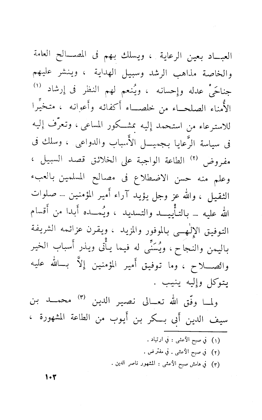 الْعباد بِعَين الرِّعَايَة ويسلك بهم فِي الْمصَالح الْعَامَّة والخاصة مَذَاهِب الرشد وسبيل الْهِدَايَة وينشر عَلَيْهِم جناحي عدله وإحسانه وينعم لَهُم النّظر فِي إرشاد الْأُمَنَاء الصلحاء من خلصاء أكفائه وأعوانه متخيرا للاسترعاء من استحمد إِلَيْهِ بمشكور المساعي وتعرف إِلَيْهِ فِي سياسة الرعايا بجميل الْأَسْبَاب والدواعي وسلك فِي مَفْرُوض الطَّاعَة الْوَاجِبَة على الْخَلَائق قصد السَّبِيل وَعلم مِنْهُ حسن الاضطلاع فِي مصَالح الْمُسلمين بالعبء الثقيل وَالله عز وَجل يُؤَيّد أراء أَمِير الْمُؤمنِينَ صلوَات الله عَلَيْهِ بالتأييد والتسديد ويمده أبدا من أَقسَام التَّوْفِيق الإلهي بالموفور والمزيد ويقرن عَزَائِمه الشَّرِيفَة بِالْيمن والنجاح ويسنى لَهُ فِيمَا يَأْتِي ويذر أَسبَاب الْخَيْر وَالصَّلَاح وَمَا توفيق أَمِير الْمُؤمنِينَ إِلَّا بِاللَّه عَلَيْهِ يتوكل وَإِلَيْهِ ينيب