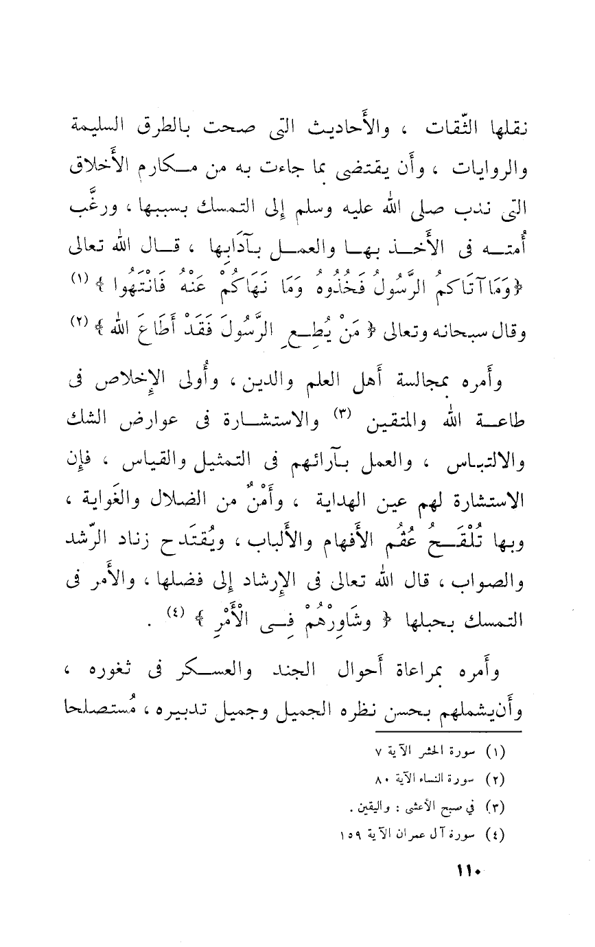 نقلهَا الثِّقَات وَالْأَحَادِيث الَّتِي صحت بالطرق السليمة وَالرِّوَايَات وَأَن يَقْتَضِي بِمَا جَاءَت بِهِ من مَكَارِم الْأَخْلَاق الَّتِي ندب صلى الله عَلَيْهِ وَسلم إِلَى التَّمَسُّك بِسَبَبِهَا وَرغب أمته فِي الْأَخْذ بهَا وَالْعَمَل بآدابها قَالَ الله تَعَالَى {وَمَا آتَاكُم الرَّسُول فَخُذُوهُ وَمَا نهاكم عَنهُ فَانْتَهوا} وَقَالَ سُبْحَانَهُ وَتَعَالَى {من يطع الرَّسُول فقد أطَاع الله}