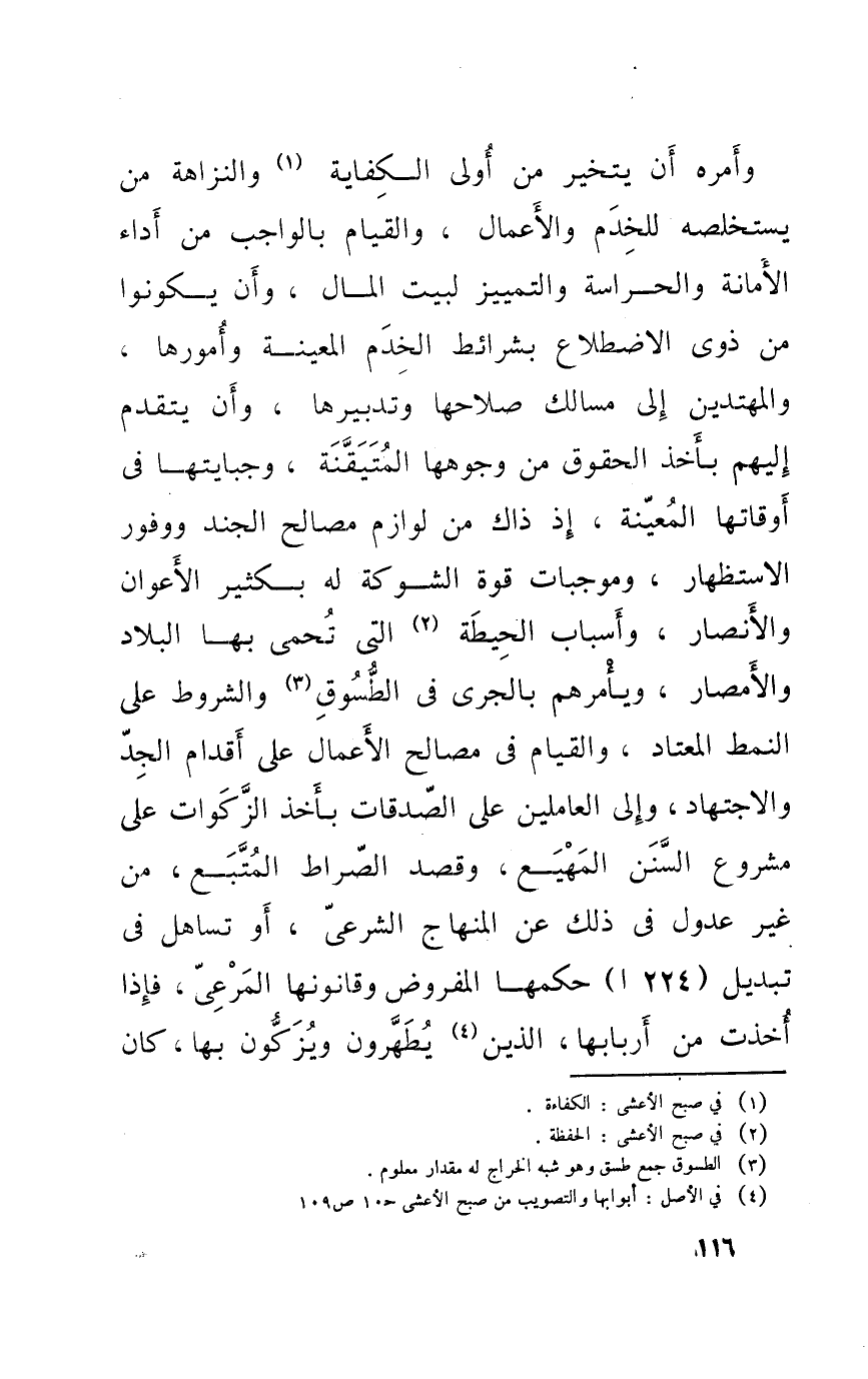 وَأمره أَن يتَخَيَّر من أولي الْكِفَايَة والنزاهة من يستخلصه للخدم والأعمال وَالْقِيَام بِالْوَاجِبِ من أَدَاء الْأَمَانَة والحراسة والتمييز لبيت المَال وَأَن يَكُونُوا من ذَوي الاضطلاع بشرائط الخدم الْمعينَة وأمورها والمهتدين إِلَى مسالك صَلَاحهَا وتدبيرها وَأَن يتَقَدَّم إِلَيْهِم بِأخذ الْحُقُوق من وجوهها المتيقنة وجبايتها فِي أَوْقَاتهَا الْمعينَة إِذْ ذَاك من لَوَازِم مصَالح الْجند ووفور الِاسْتِظْهَار وموجبات قُوَّة الشَّوْكَة لَهُ بِكَثِير الأعوان وَالْأَنْصَار وَأَسْبَاب الحيطة الَّتِي تحمى بهَا الْبِلَاد والأمصار وَيَأْمُرهُمْ بالجري فِي الطسوق والشروط على النمط الْمُعْتَاد وَالْقِيَام فِي مصَالح الْأَعْمَال على أَقْدَام الْجد وَالِاجْتِهَاد وَإِلَى العاملين على الصَّدقَات بِأخذ الزكوات على مَشْرُوع السّنَن المهيع وَقصد الصِّرَاط المتبع من غير عدُول فِي ذَلِك عَن الْمِنْهَاج الشَّرْعِيّ أَو تساهل فِي تَبْدِيل حكمهَا الْمَفْرُوض وقانونها المرعي فَإِذا أخذت من أَرْبَابهَا الَّذين يطهرون ويزكون بهَا كَانَ