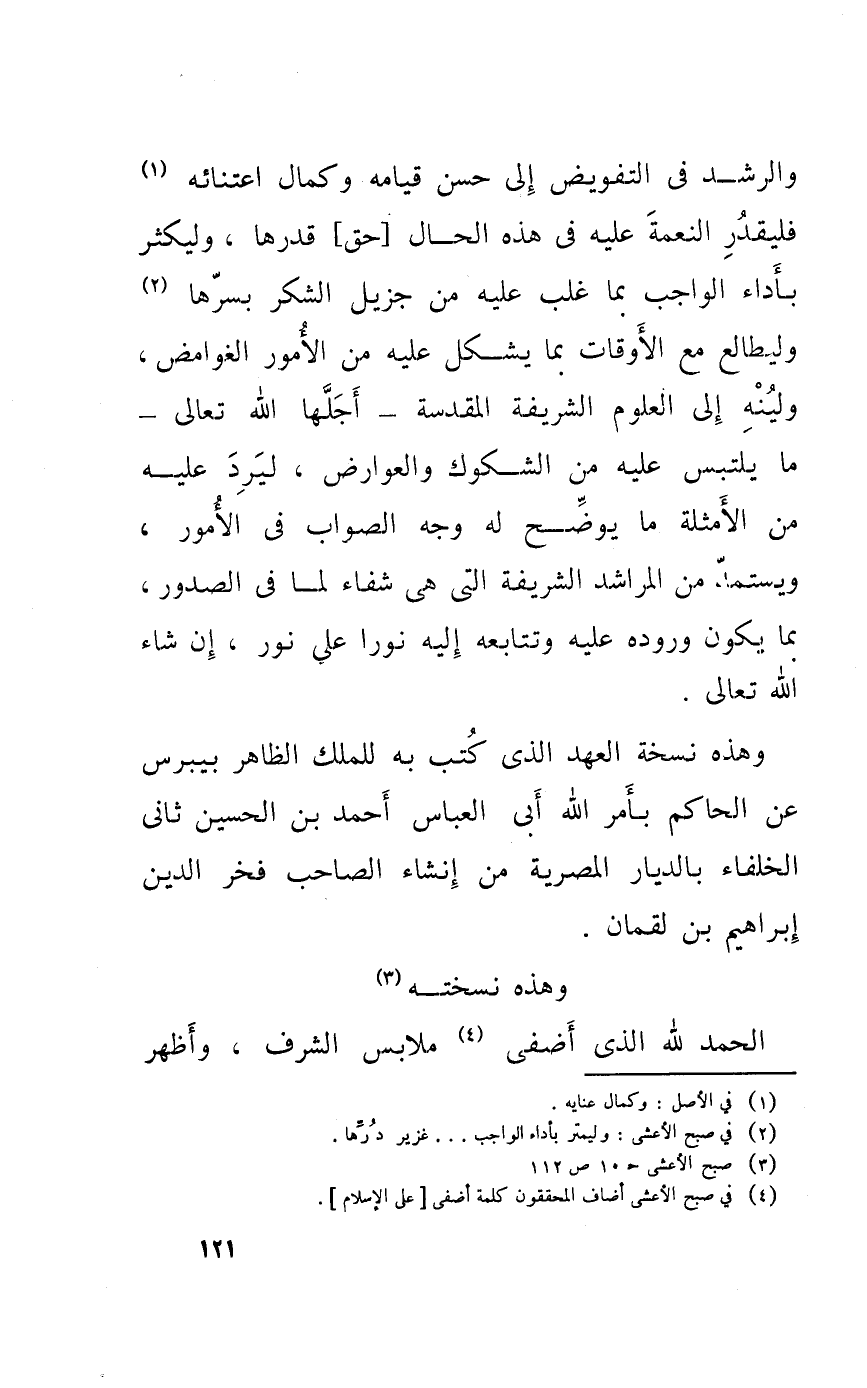 وَهَذِه نُسْخَة الْعَهْد الَّذِي كتب بِهِ للْملك الظَّاهِر بيبرس عَن الْحَاكِم بِأَمْر الله أبي الْعَبَّاس أَحْمد بن الْحُسَيْن ثَانِي الْخُلَفَاء بالديار المصرية من إنْشَاء الصاحب فَخر الدّين ابراهيم بن لُقْمَان