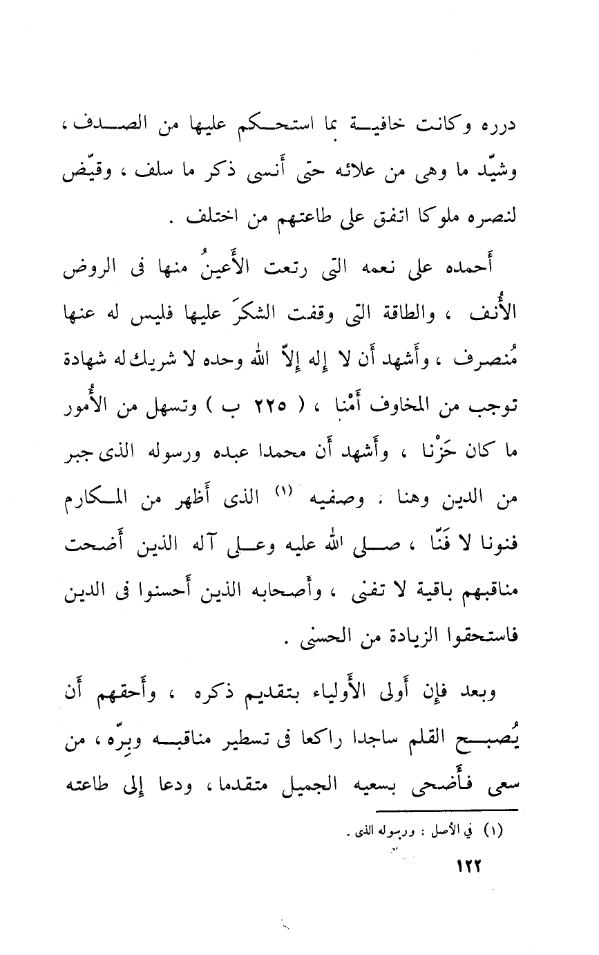 وَبعد فَإِن أولى الْأَوْلِيَاء بِتَقْدِيم ذكره وأحقهم أَن يصبح الْقَلَم سَاجِدا رَاكِعا فِي تسطير مناقبه وبره من سعى فأضحى بسعيه الْجَمِيل مُتَقَدما ودعا إِلَى طَاعَته