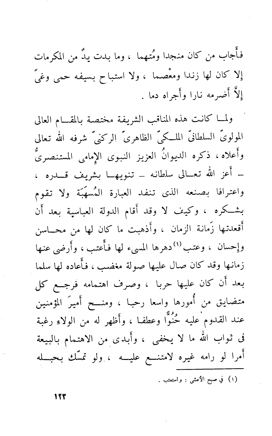 وَلما كَانَت هَذِه المناقب الشَّرِيفَة مُخْتَصَّة بالْمقَام العالي المولوي السلطاني الملكي الظَّاهِرِيّ الركني شرفه الله تَعَالَى وَأَعلاهُ ذكره الدِّيوَان الْعَزِيز النَّبَوِيّ الإمامي المستنصري أعز الله تَعَالَى سُلْطَانه تنويها بشريف قدره واعترافا بصنعه الَّذِي تنفد الْعبارَة المسهبة وَلَا تقوم بشكره وَكَيف لَا وَقد أَقَامَ الدولة العباسية بعد أَن أقعدتها زمانة الزَّمَان وأذهبت مَا كَانَ لَهَا من محَاسِن وإحسان وعتب دهرها المسئ لَهَا فأعتب وأرضى عَنْهَا زمانها وَقد كَانَ صال عَلَيْهَا صولة مغضب فَأَعَادَ لَهَا سلما بعد أَن كَانَ عَلَيْهَا حَربًا وَصرف اهتمامه فَرجع كل متضايق من أمورها وَاسِعًا رحبا ومنح أَمِير الْمُؤمنِينَ عِنْد الْقدوم عَلَيْهِ حنوا وعطفا وَأظْهر لَهُ من الْوَلَاء رَغْبَة فِي ثَوَاب الله مَا لَا يحفى وَأبْدى من الاهتمام بالبيعة أمرا لَو رامه غَيره لامتنع عَلَيْهِ وَلَو تمسك بحبله