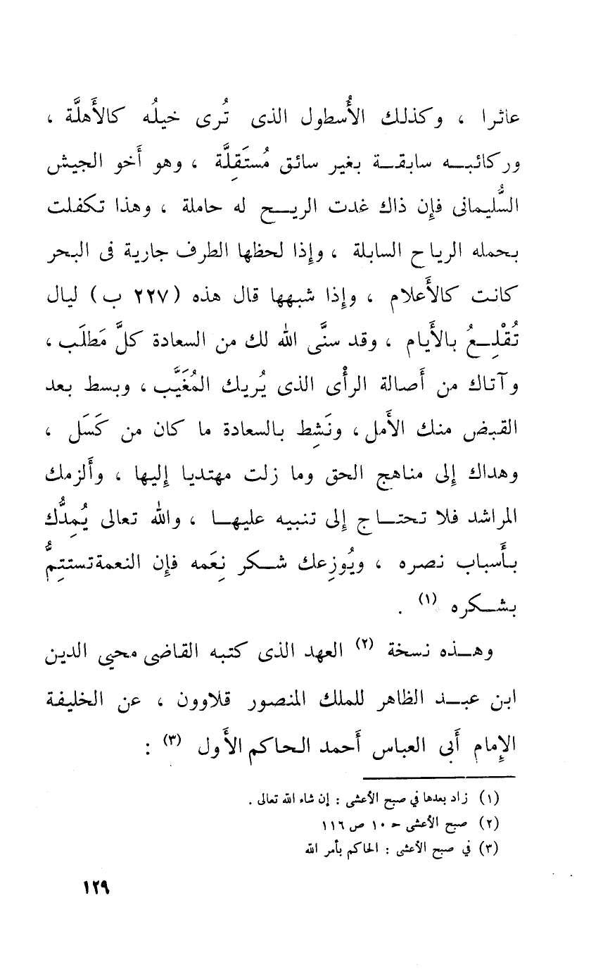 عاثرا وَكَذَلِكَ الأسطول الَّذِي ترى خيله كالأهلة وركائبه سَابِقَة بِغَيْر سائق مُسْتَقلَّة وَهُوَ أَخُو الْجَيْش السُّلَيْمَانِي فَإِن ذَاك غَدَتْ الرّيح لَهُ حاملة وَهَذَا تكفلت بِحمْلِهِ الرِّيَاح السابلة وَإِذا لحظها الطّرف جَارِيَة فِي الْبَحْر كَانَت كالأعلام وَإِذا شبهها قَالَ هَذِه لَيَال تقلع بِالْأَيَّامِ وَقد سنى الله لَك من السَّعَادَة كل مطلب وآتاك من أَصَالَة الرَّأْي الَّذِي يُرِيك المغيب وَبسط بعد الْقَبْض مِنْك الأمل ونشط بالسعادة مَا كَانَ من كسل وهداك إِلَى مناهج الْحق وَمَا زلت مهتديا إِلَيْهَا وألزمك المراشد فَلَا تحْتَاج إِلَى تَنْبِيه عَلَيْهَا وَالله تَعَالَى يمدك بِأَسْبَاب نَصره ويوزعك شكر نعمه فَإِن النِّعْمَة تستتم بشكره