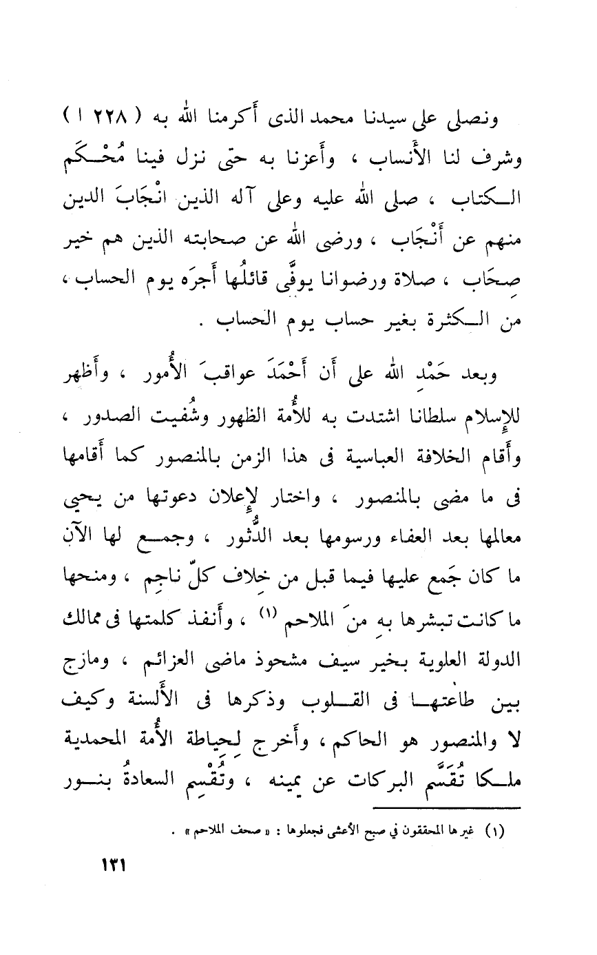 وَبعد حمد الله على أَن أَحْمد عواقب الْأُمُور وَأظْهر لِلْإِسْلَامِ سُلْطَانا اشتدت بِهِ للْأمة الظُّهُور وشفيت الصُّدُور وَأقَام الْخلَافَة العباسية فِي هَذَا الزَّمن بالمنصور كَمَا أَقَامَهَا فِي مَا مضى بالمنصور وَاخْتَارَ لإعلان دعوتها من يحيي معالمها بعد العفاء ورسومها بعد الدُّثُور وَجمع لَهَا الْآن مَا كَانَ جمع عَلَيْهَا فِيمَا قبل من خلاف كل ناجم ومنحها مَا كَانَت تبشرها بِهِ من الْمَلَاحِم وأنفذ كلمتها فِي ممالك الدولة العلوية بِخَير سيف مشحوذ ماضي العزائم ومازج بَين طاعتها فِي الْقُلُوب وَذكرهَا فِي الْأَلْسِنَة وَكَيف لَا والمنصور هُوَ الْحَاكِم وَأخرج لحياطه الْأمة المحمدية ملكا تقسم البركات عَن يَمِينه وتقسم السَّعَادَة بِنور
